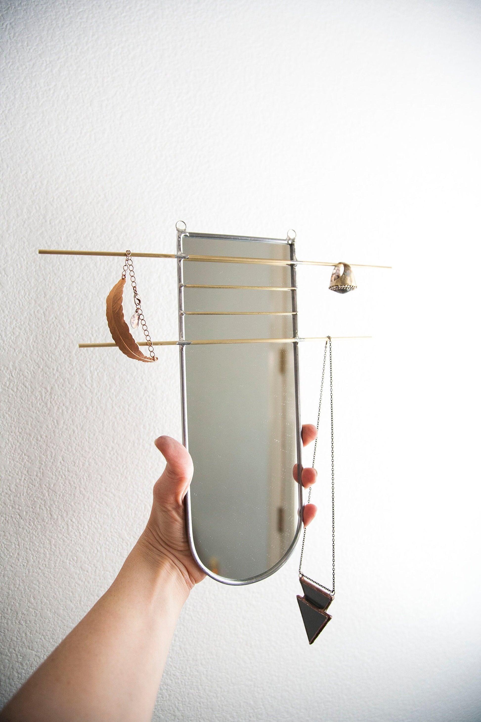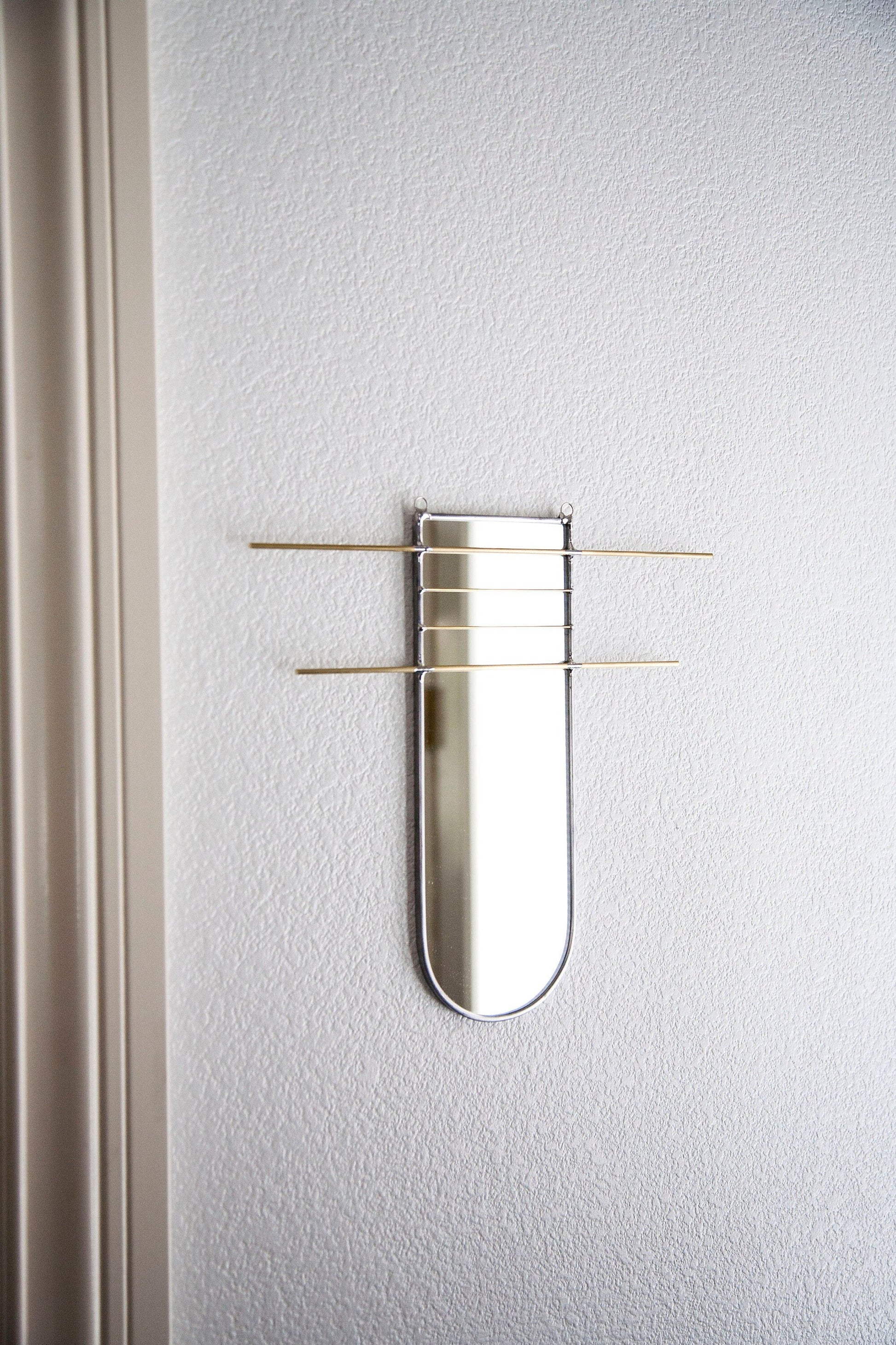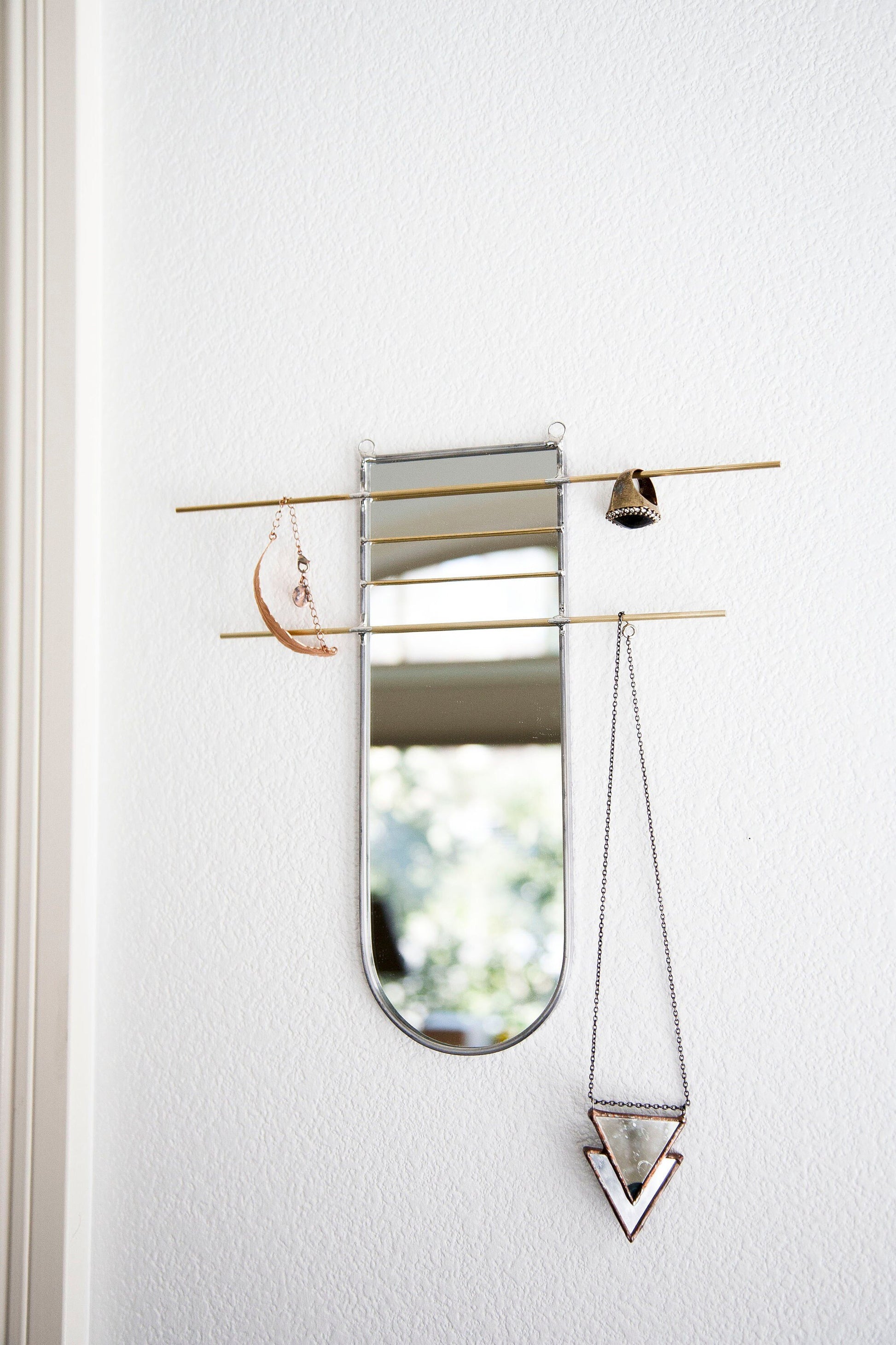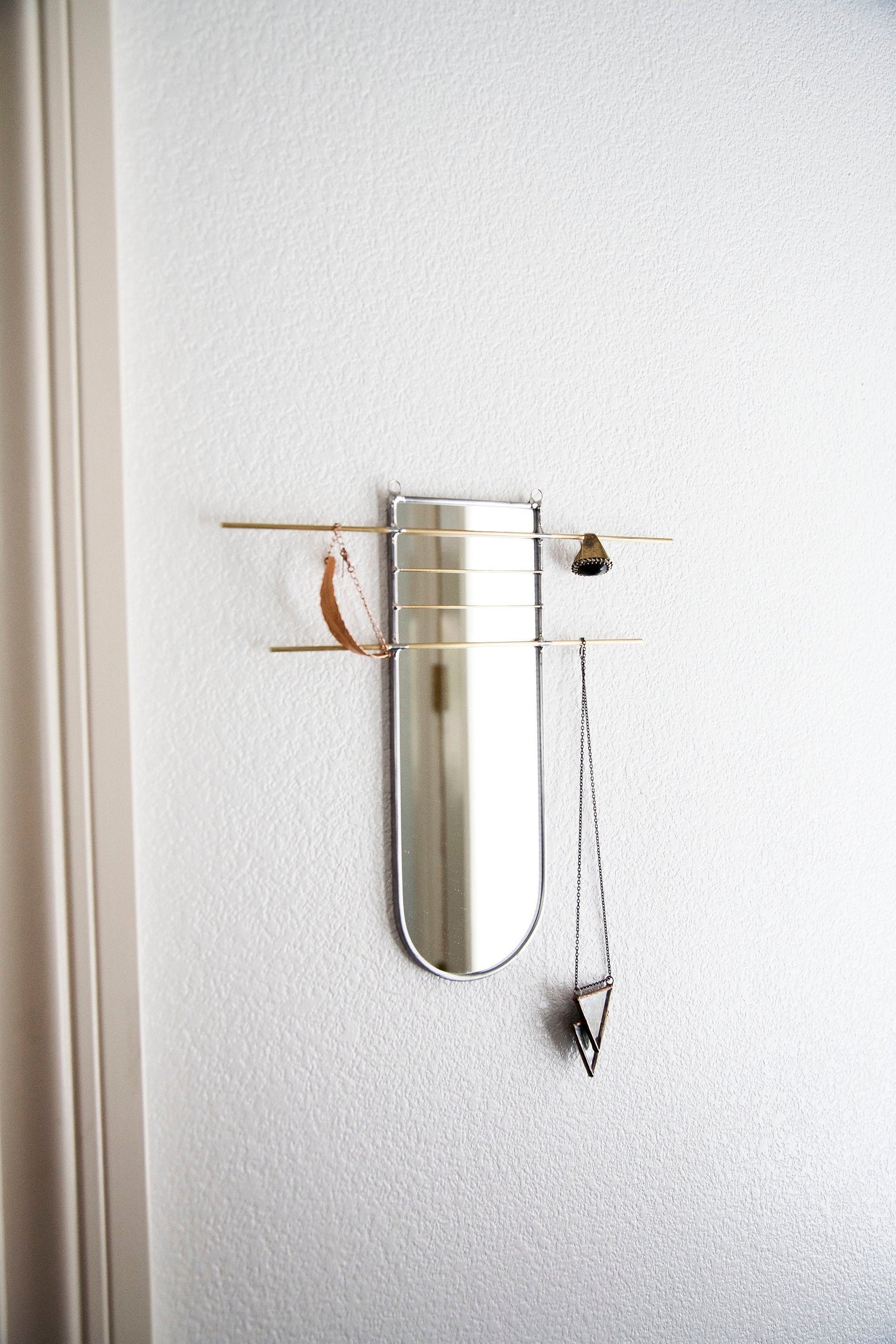 Mirror organizer is cut, sealed and assembled all by hand. Using stained glass techniques with lead came and solder, this minimally designed mirror offers brass bars to easily display and organize jewelry or other belongings.