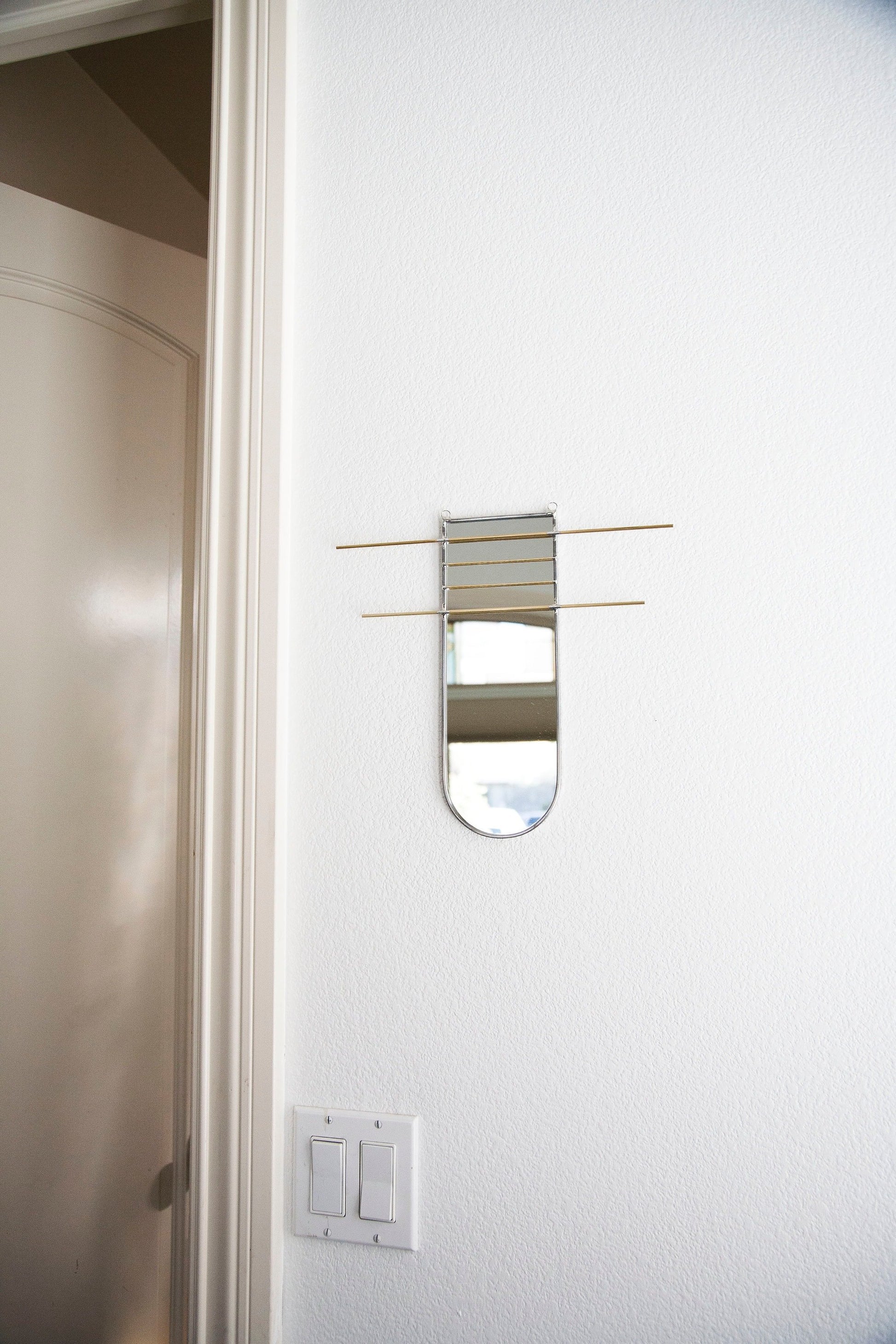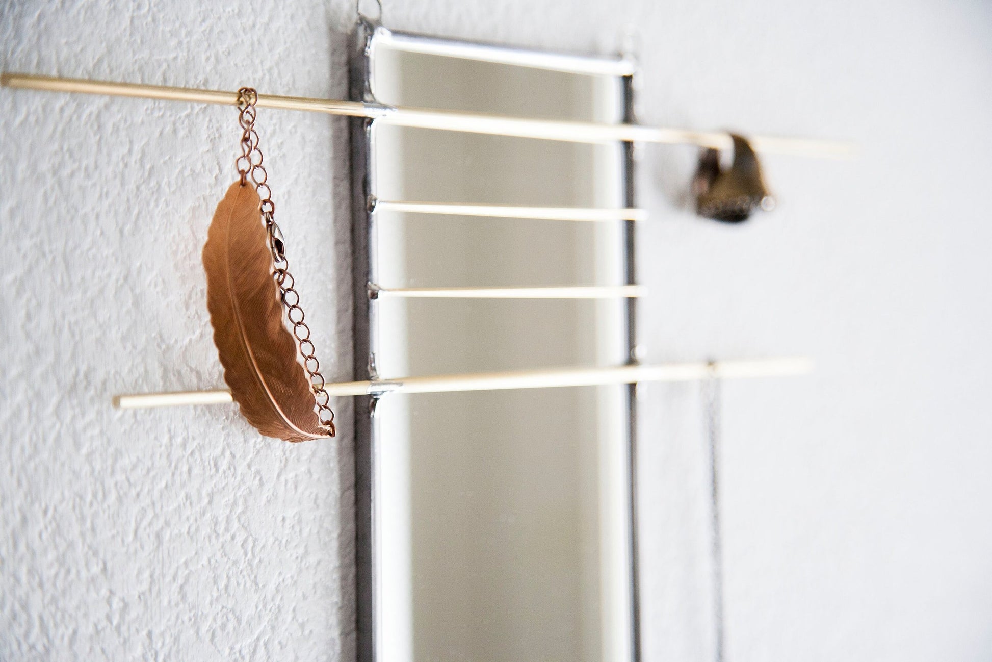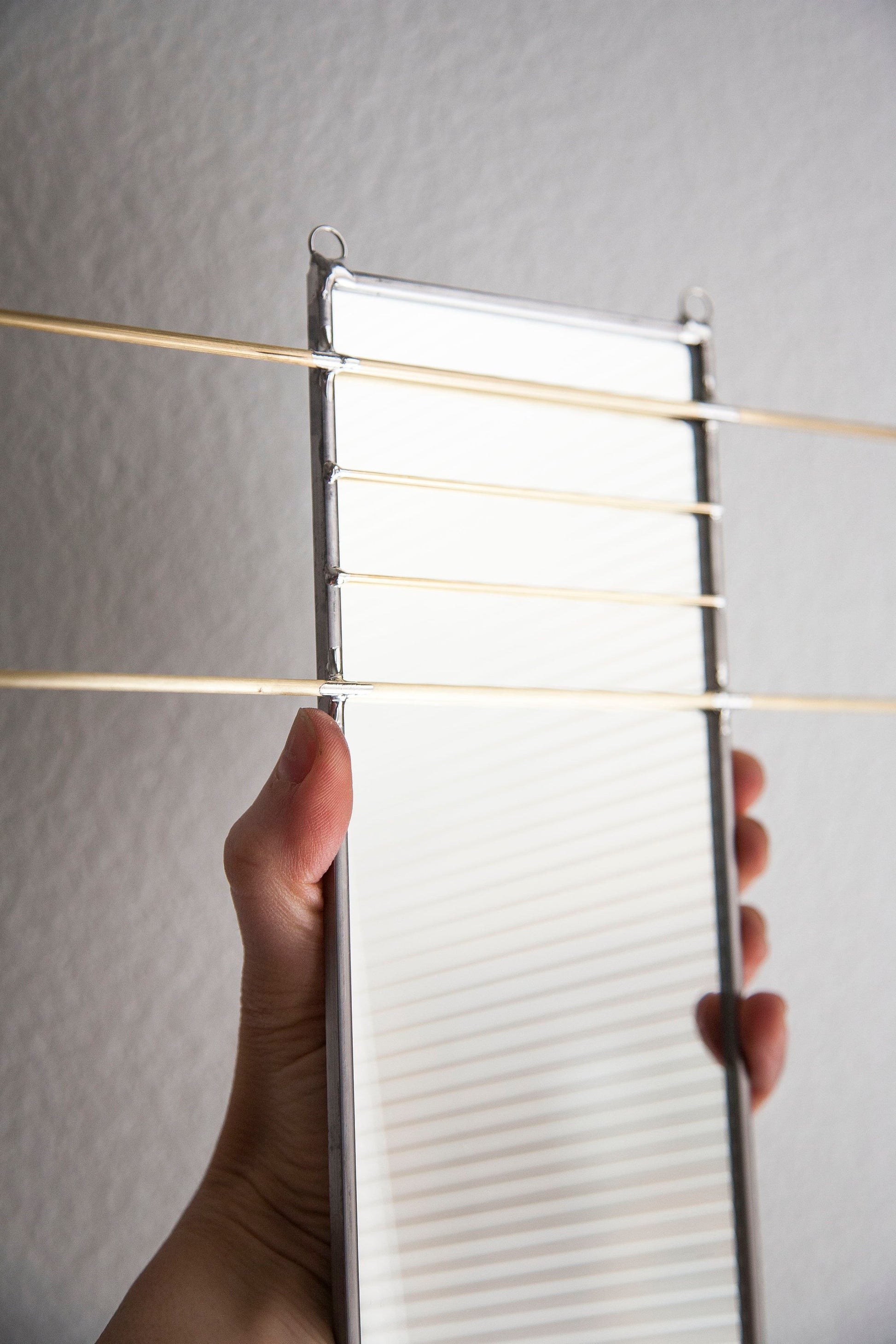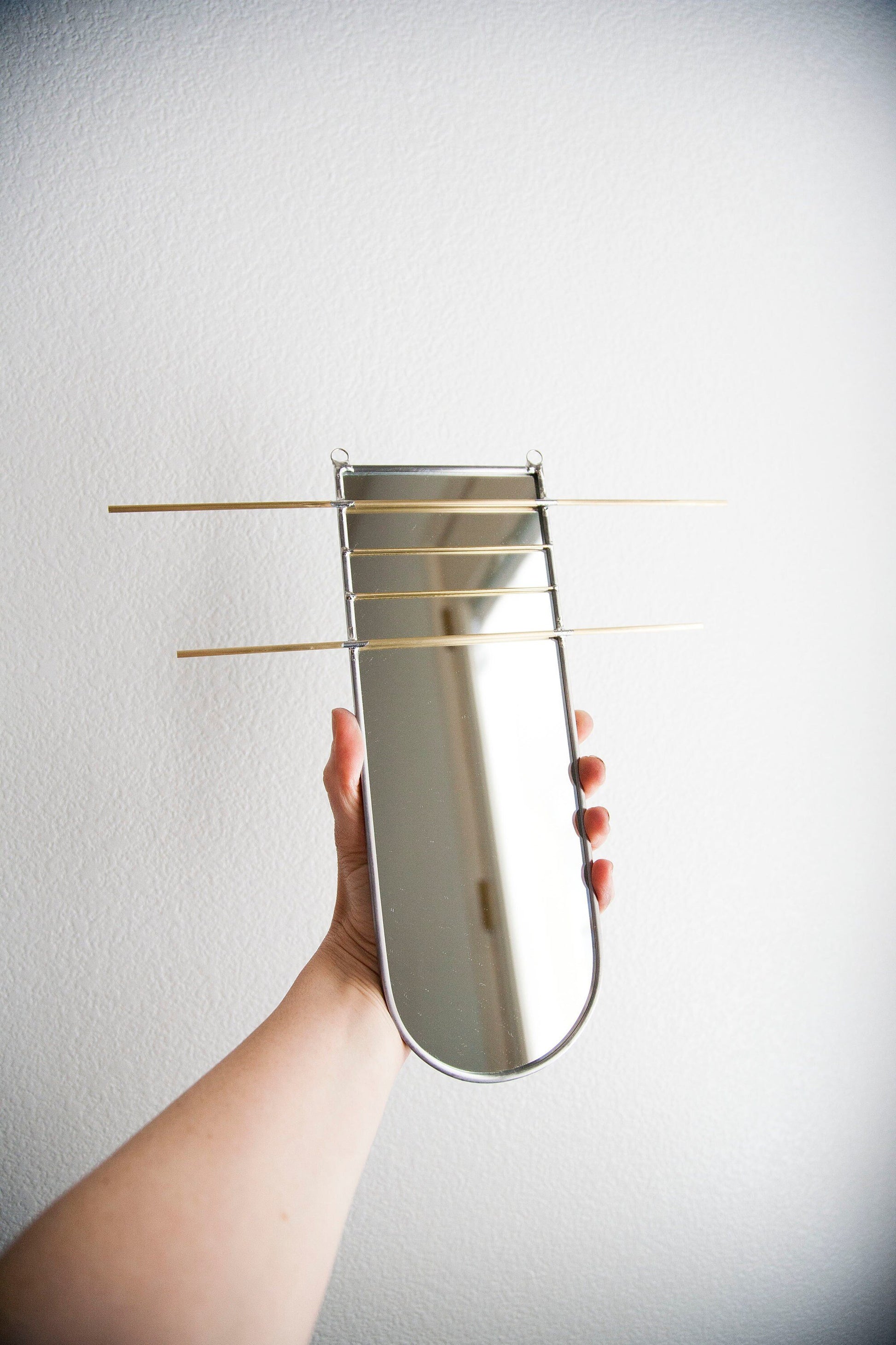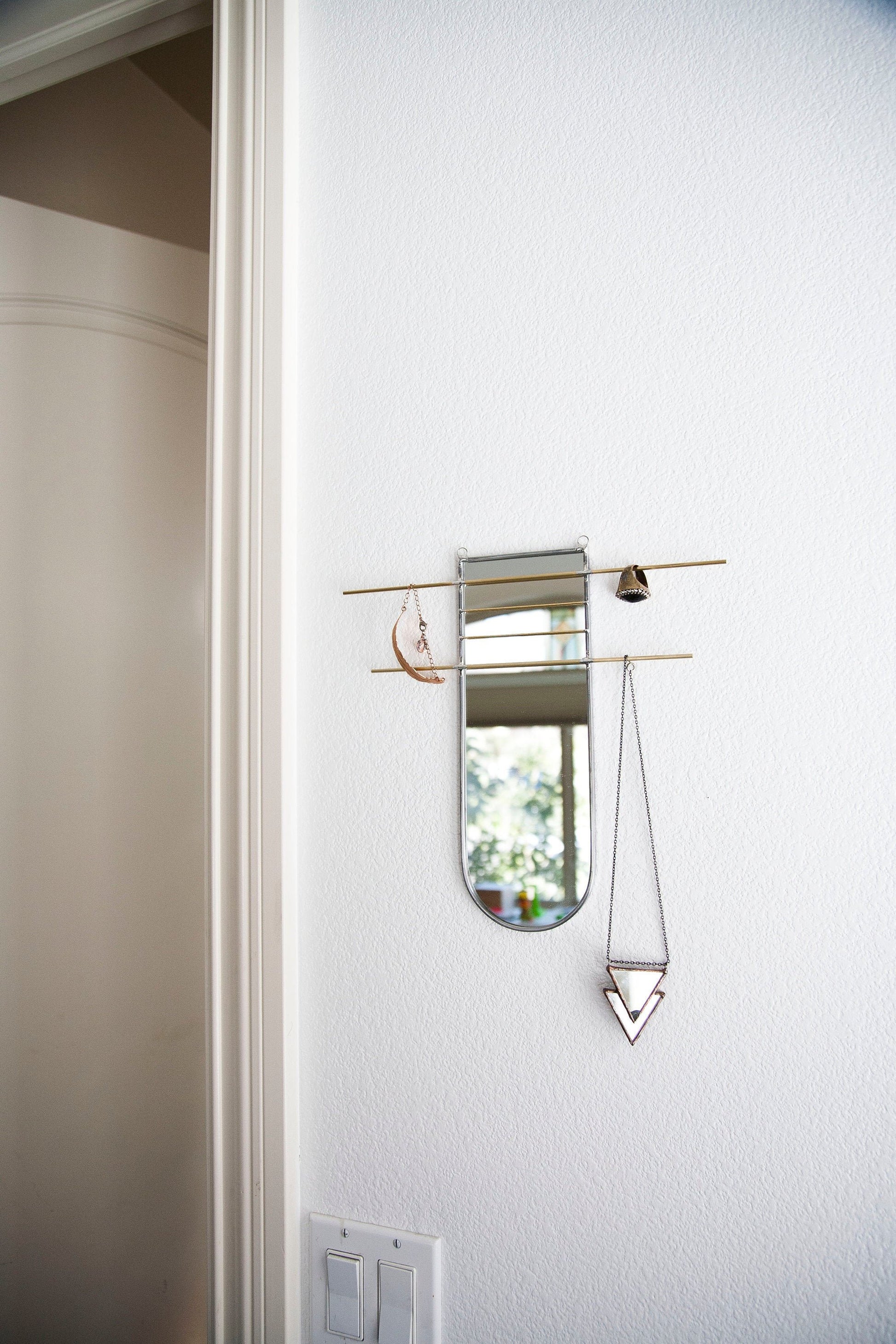 Mirror organizer is cut, sealed and assembled all by hand. Using stained glass techniques with lead came and solder, this minimally designed mirror offers brass bars to easily display and organize jewelry or other belongings.