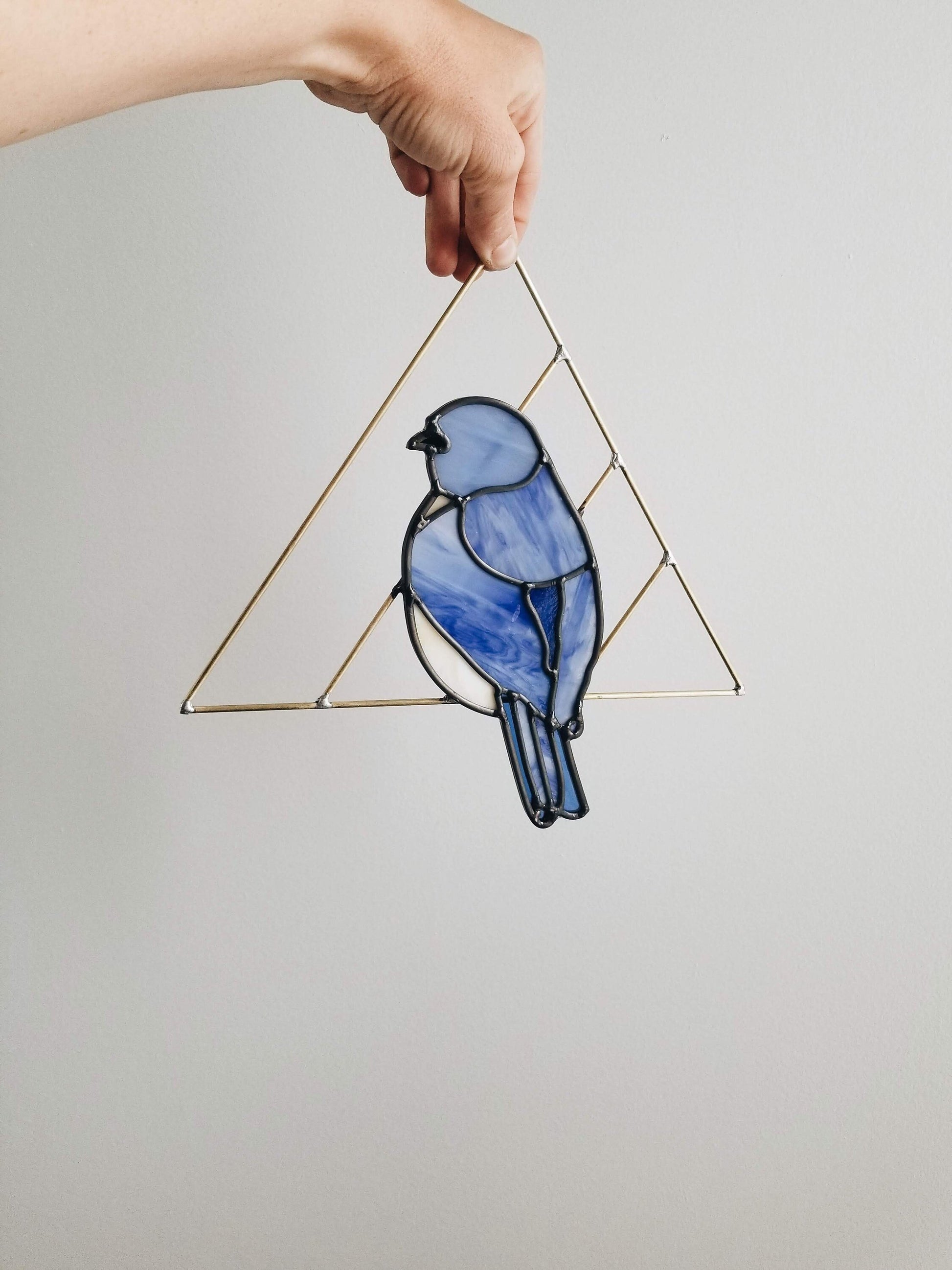 Bluebird is cut and assembled all by hand. Using stained glass techniques with lead came and solder to create this minimally designed bird piece. Bluebird is held by handmade brass triangle.