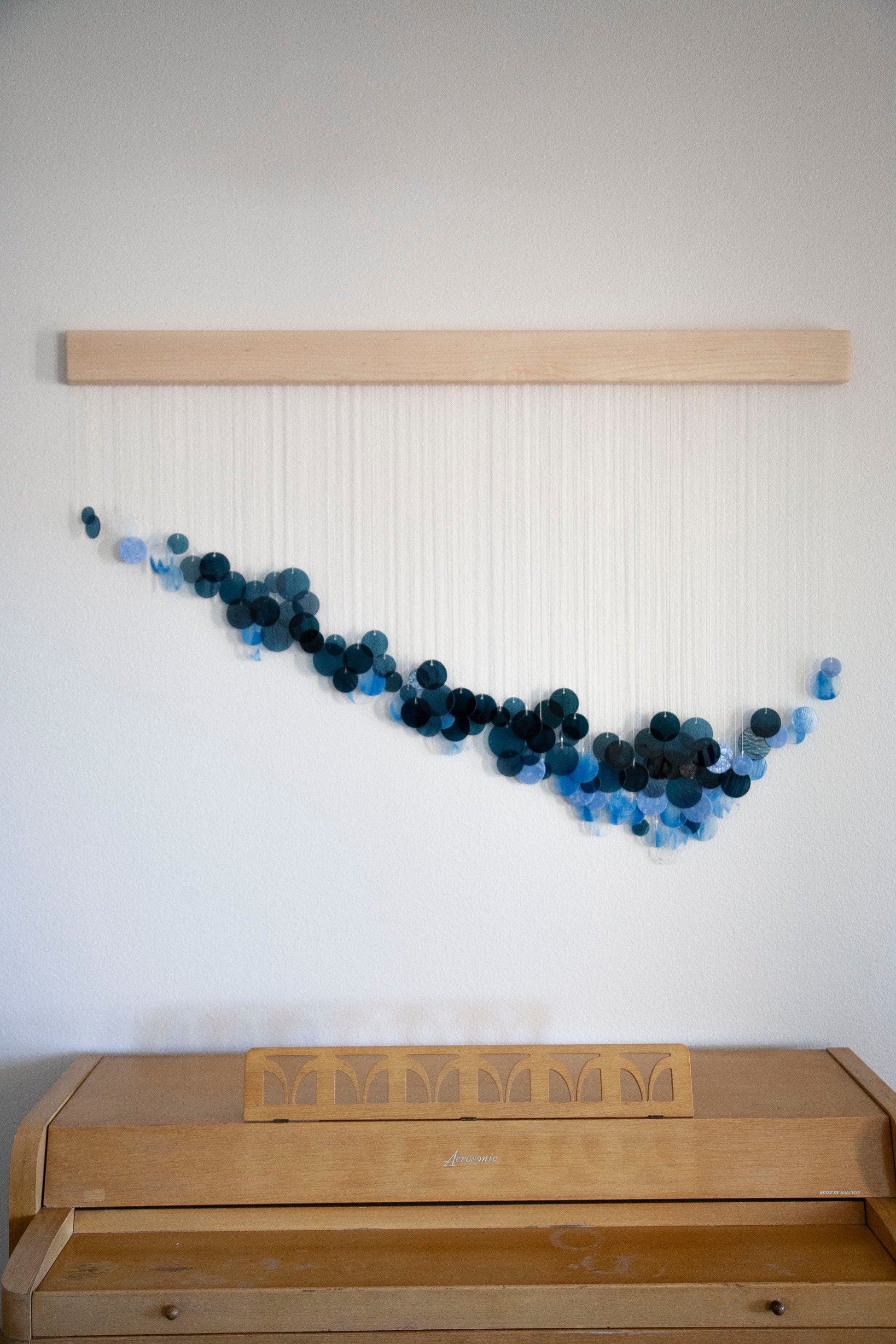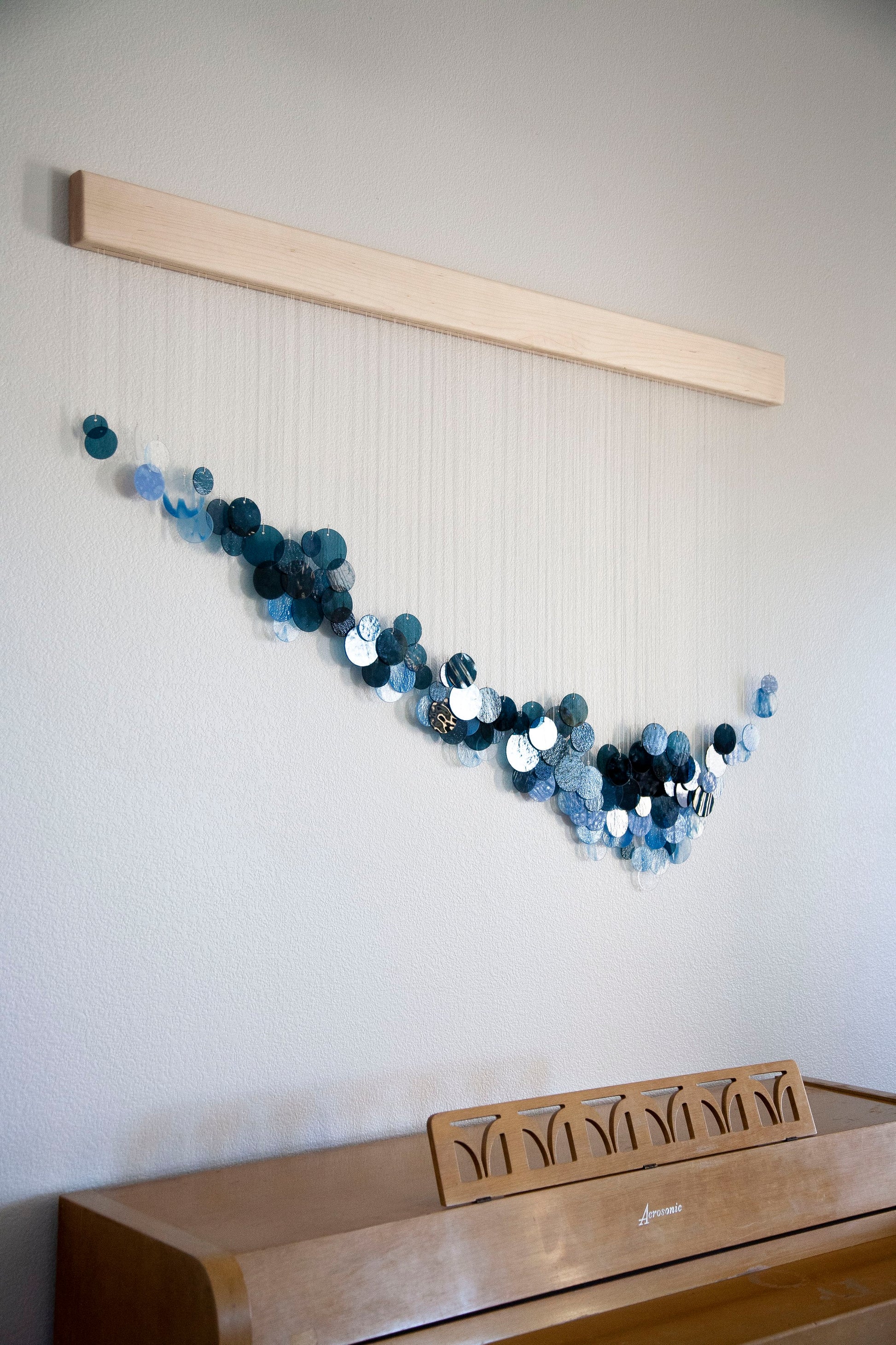 This large scale wall hanging is hand crafted by the artist, consisting of 100+ pieces of glass. Unique glass textures and colors were hand cut, drilled and finished with smooth edges. Each piece is hung by waxed twine and detailed with frosted beads. This art piece is held by a handcrafted maple wood piece that is ready to hang with two key holes on the back.