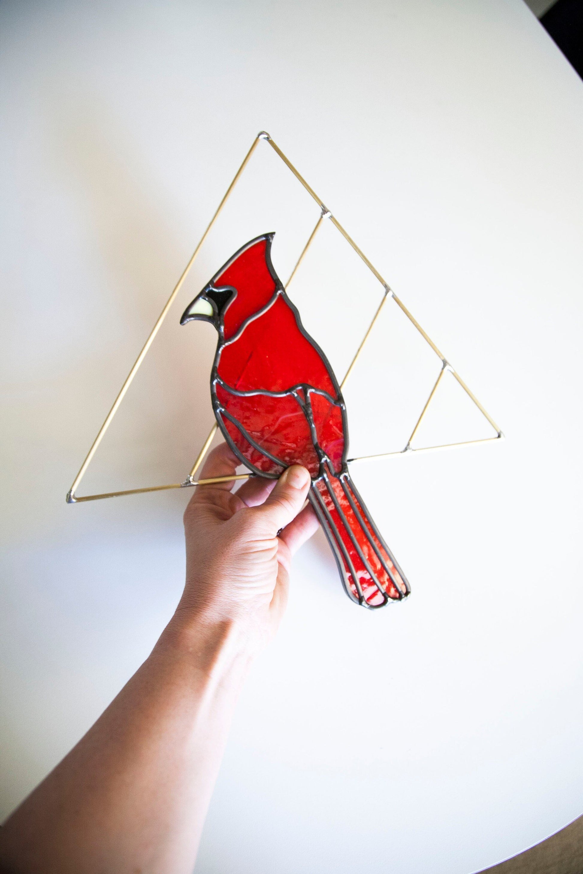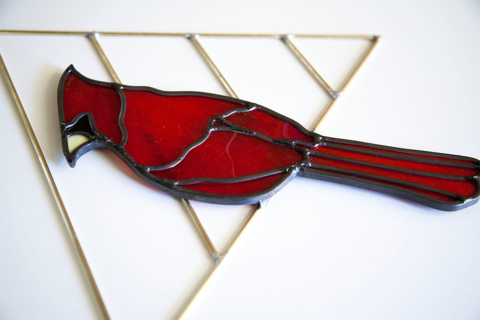 Cardinal is cut and assembled all by hand. Using stained glass techniques with lead came and solder to create this minimally designed bird piece. Cardinal is held by handmade brass triangle.