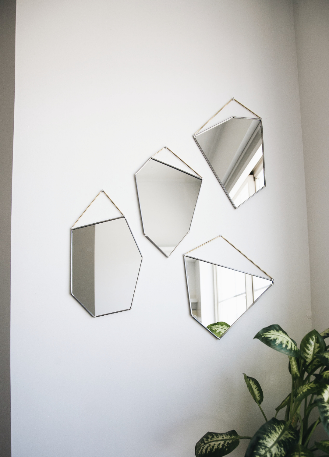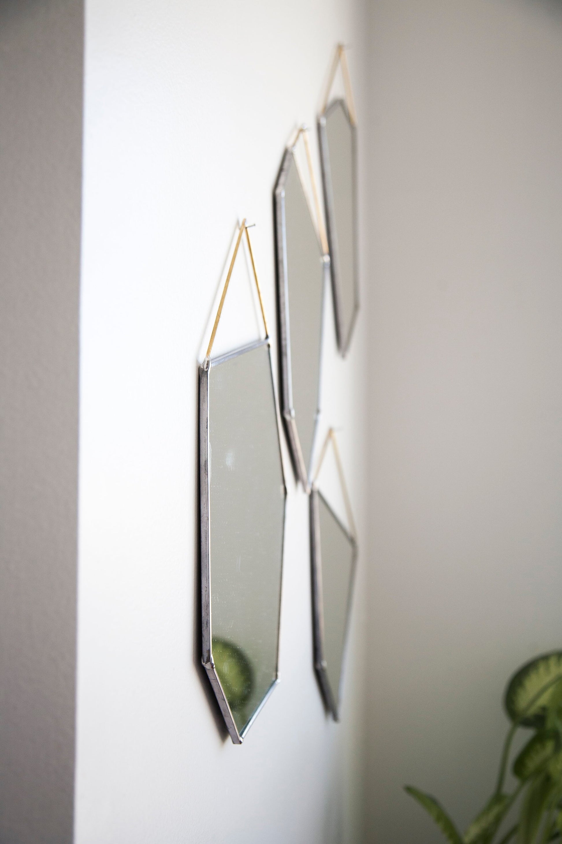 Mirrors are cut, soldered, sealed and assembled all by hand. Using stained glass techniques with lead came and solder, these modern geo mirrors are ready to hang with brass rods.