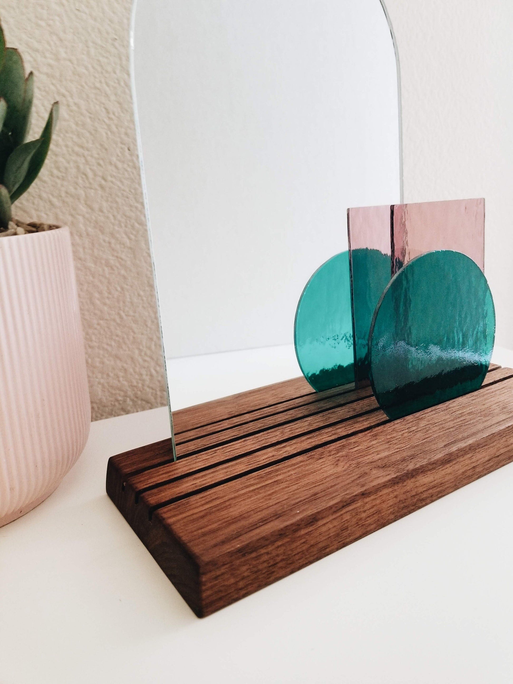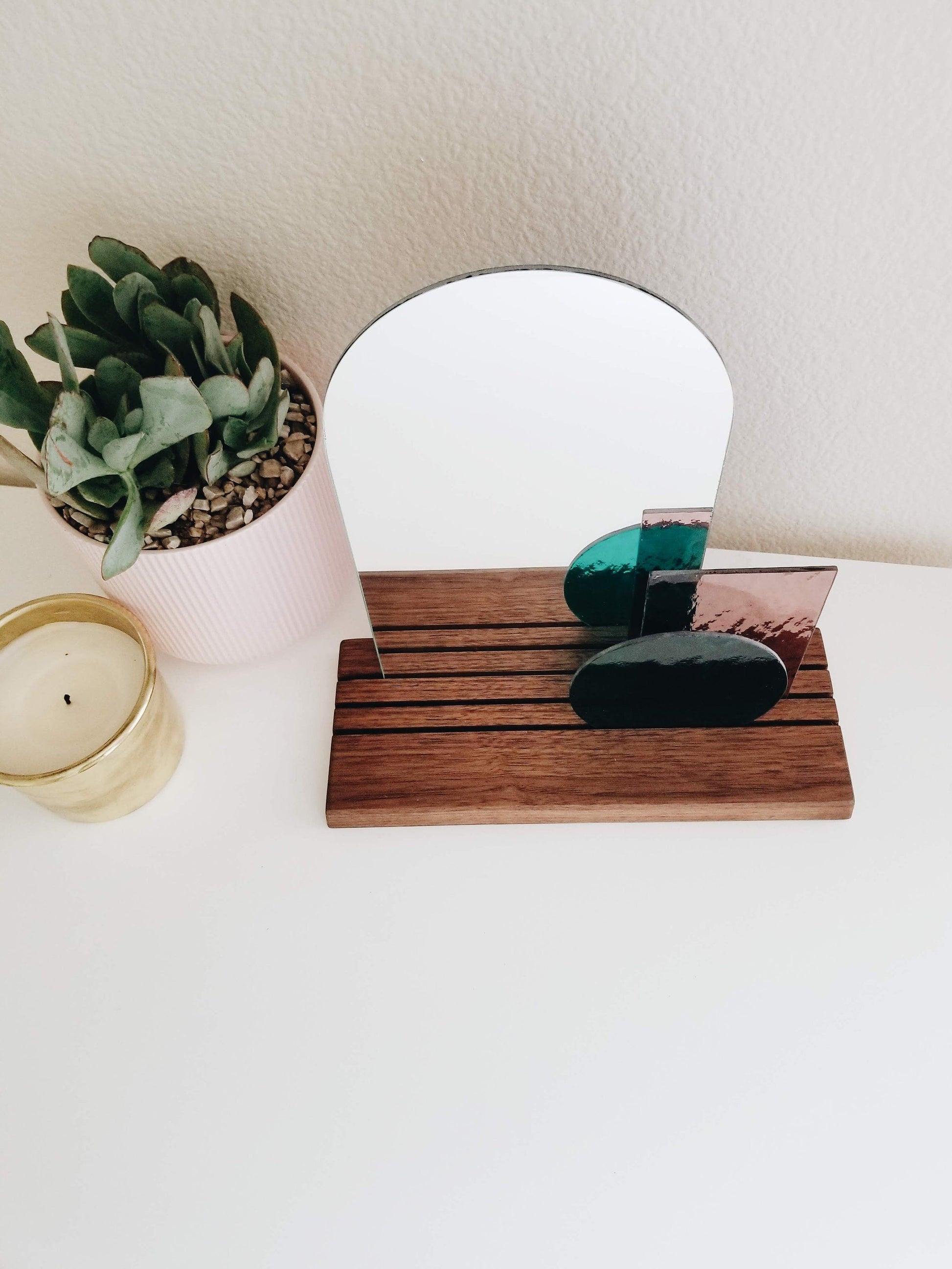 Glass vanity mirror is handcrafted. Hand cut mirror and colored glass sit into a natural walnut wood stand. Great for a bathroom, bedroom countertop or shelf decor!