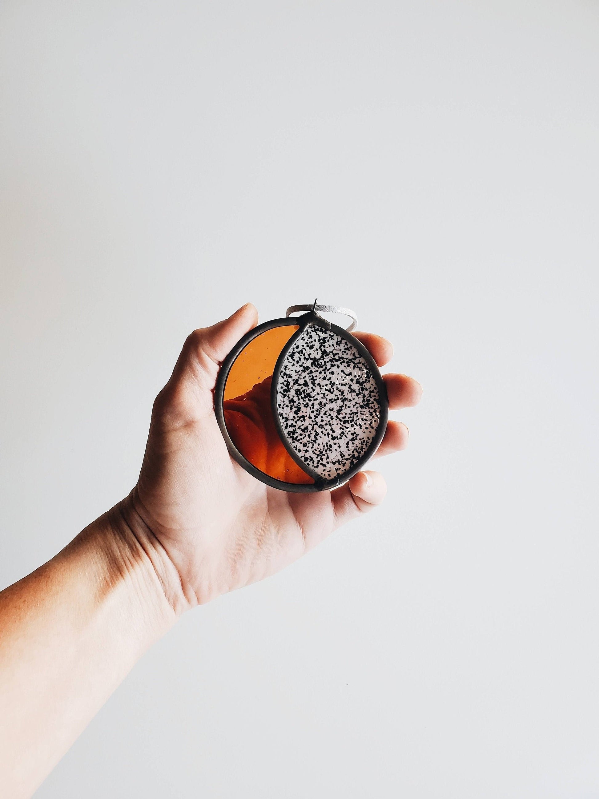 Mini Moon is cut and assembled all by hand. Using stained glass techniques with lead came and solder to create this minimally designed glass moon.