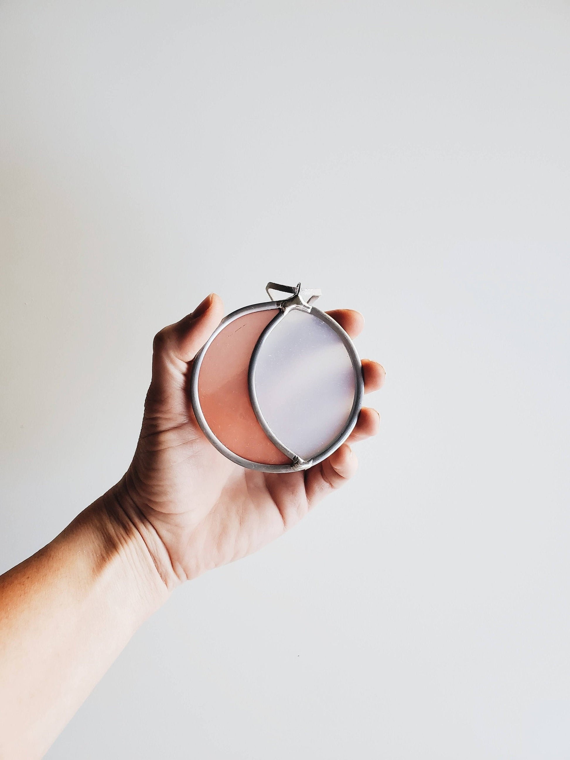 Mini Moon is cut and assembled all by hand. Using stained glass techniques with lead came and solder to create this minimally designed glass moon.