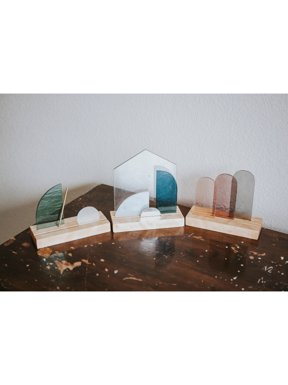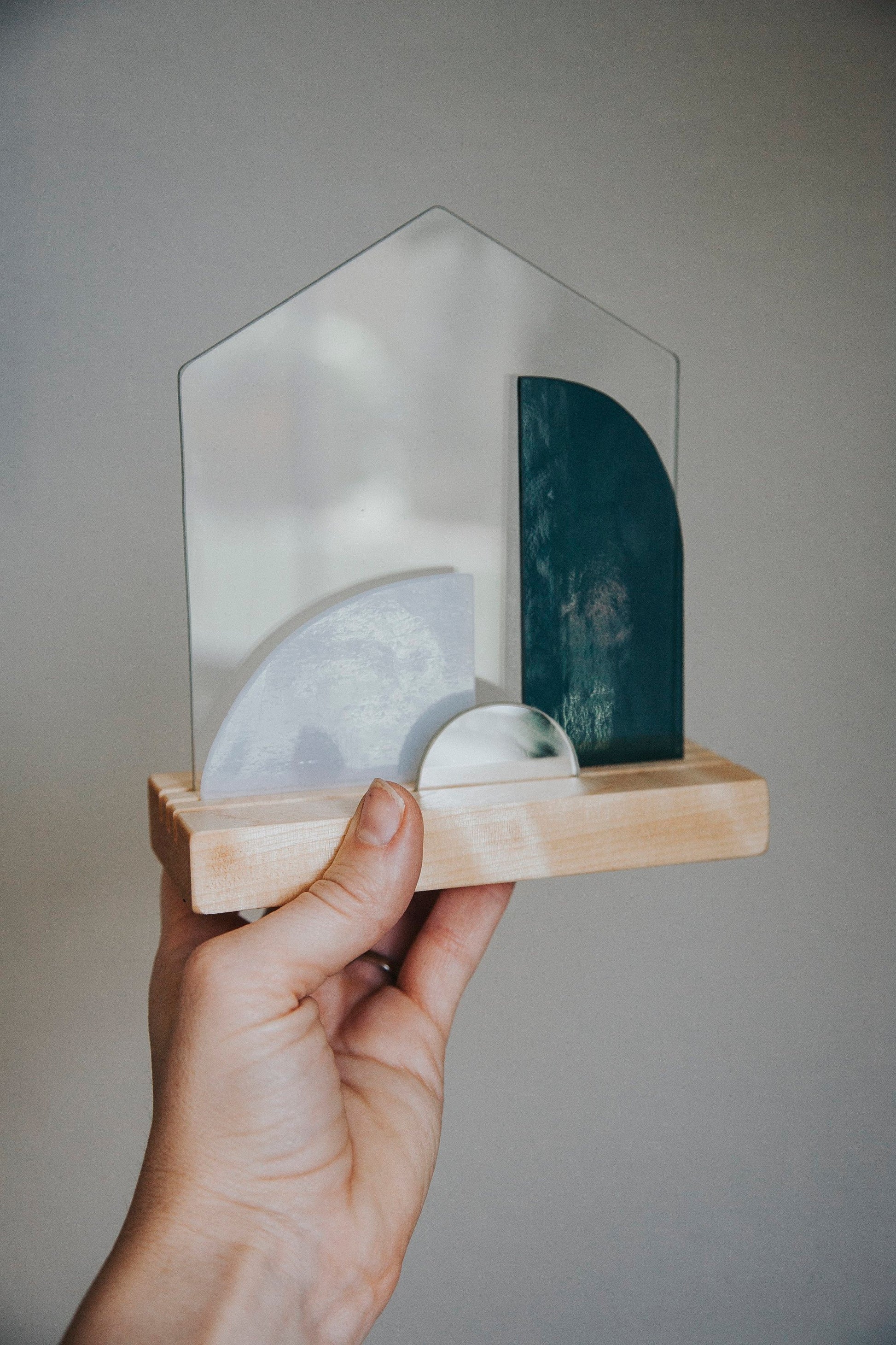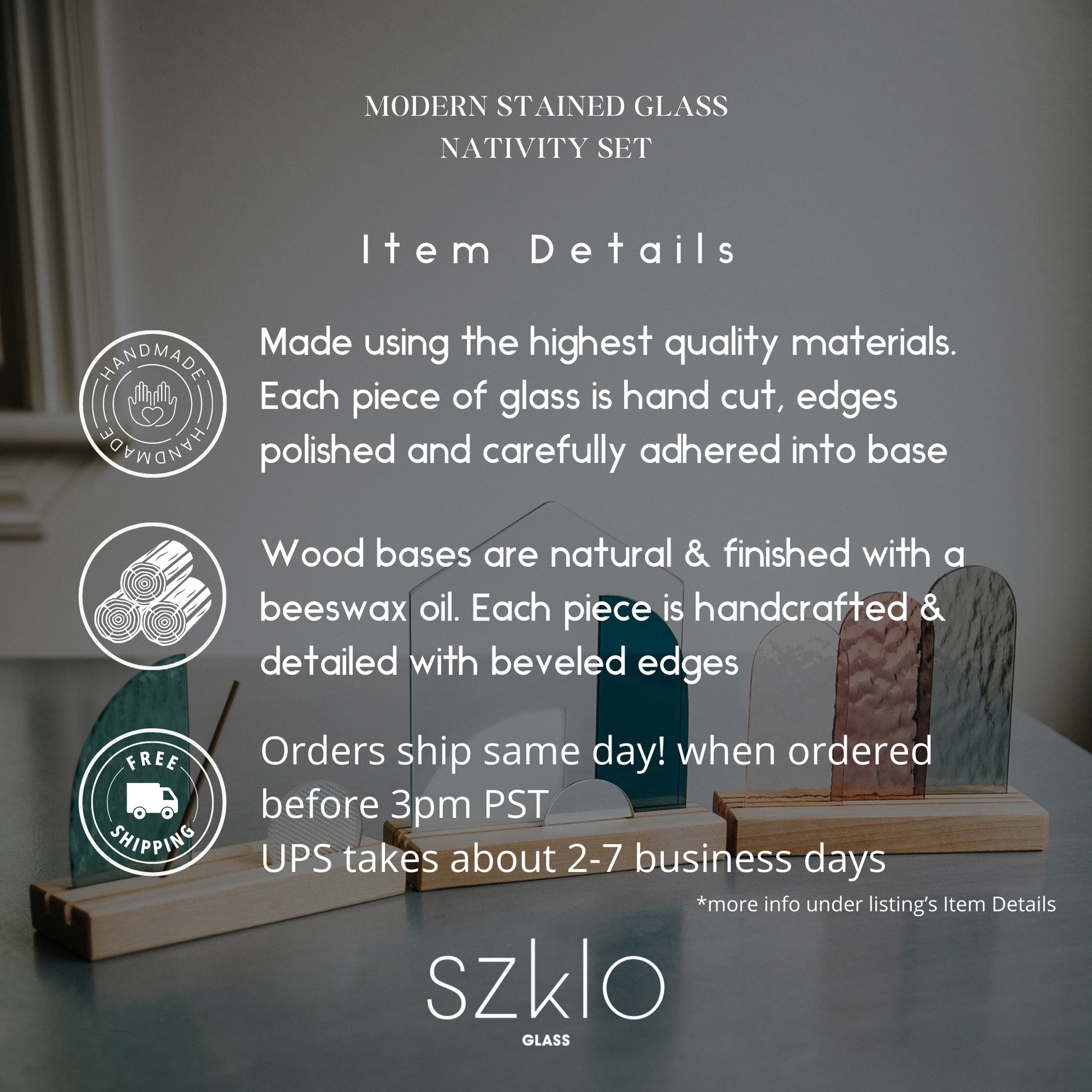 Modern Nativity is a unique, handcrafted piece, designed by the artist. Each piece of glass is hand cut, edges are polished & then adhered into a wood base. Wood bases are cut by hand, by artist’s woodworking husband of Sylvester & Sons. Glass & wood colors can vary slightly or appear slightly different in person than on screen.