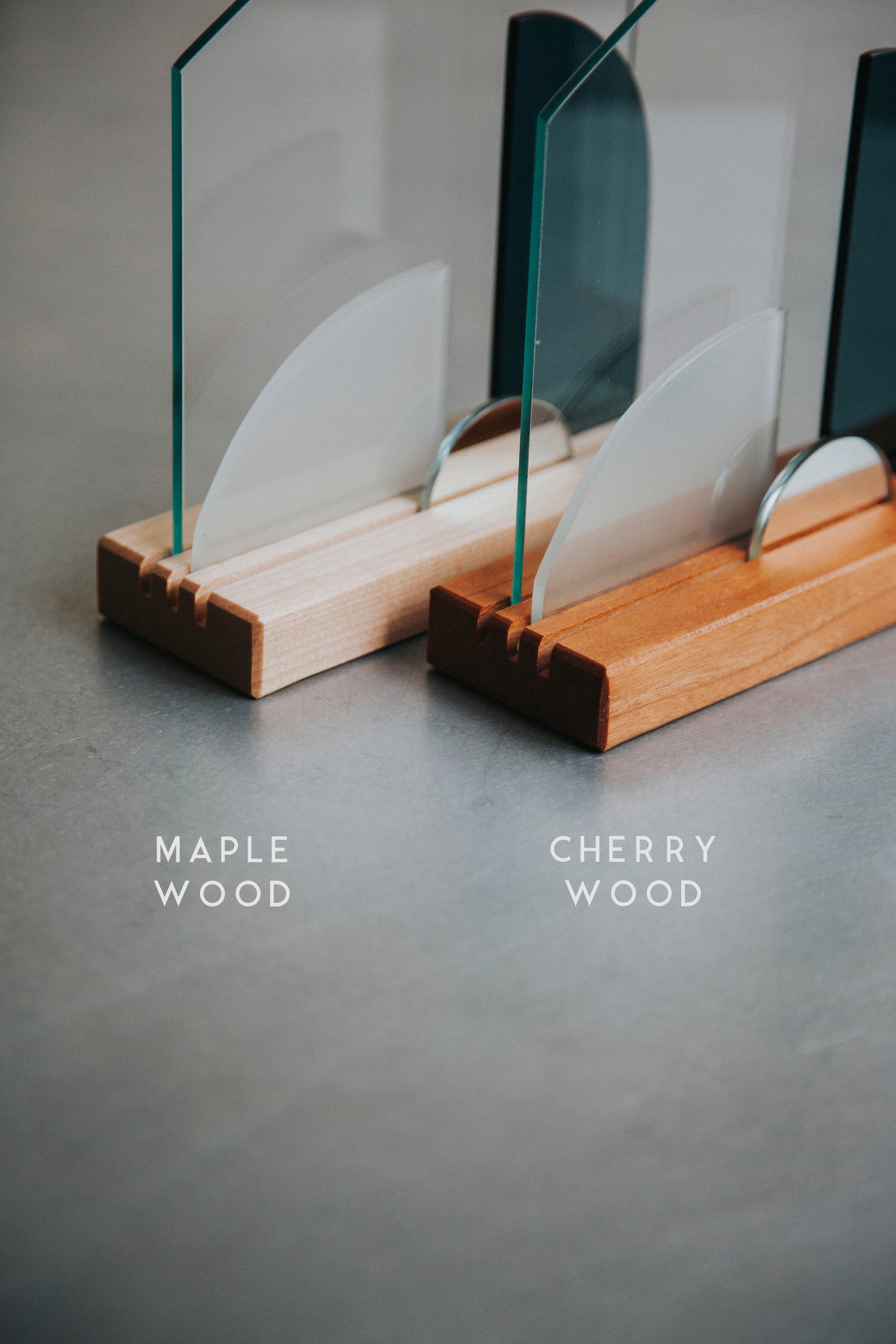 - Wood Base: Cherry (dark) or Maple Wood (light). NOT stained. Color of wood is natural from the tree it comes from and coloration can vary. Finished with a natural oil finish for longevity.