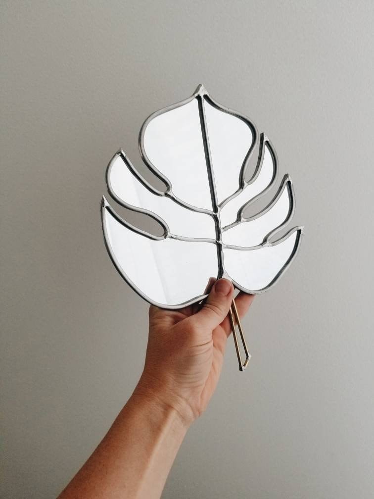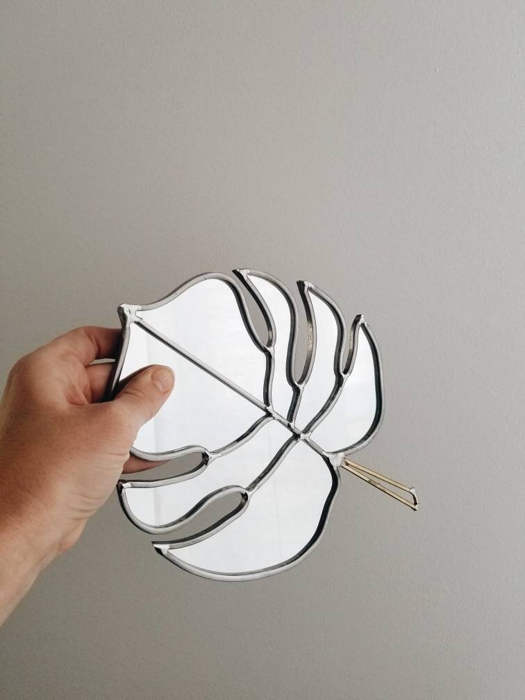 Monstera mirror is cut, sealed and assembled all by hand. Using stained glass techniques with lead came and solder, this contemporary designed mirror uses brass detail for the steam. Hangs by jump-ring at top