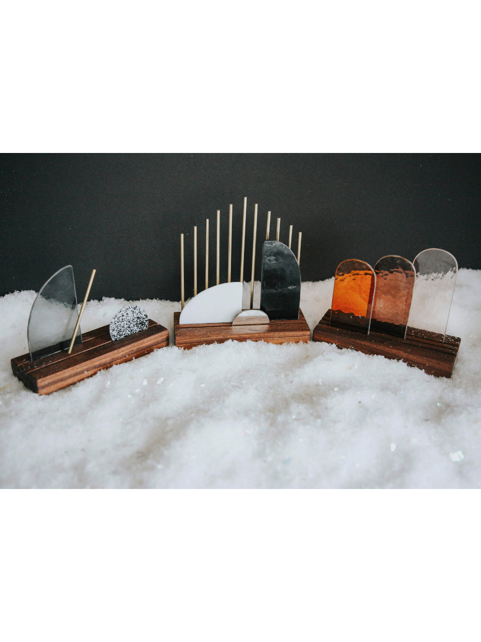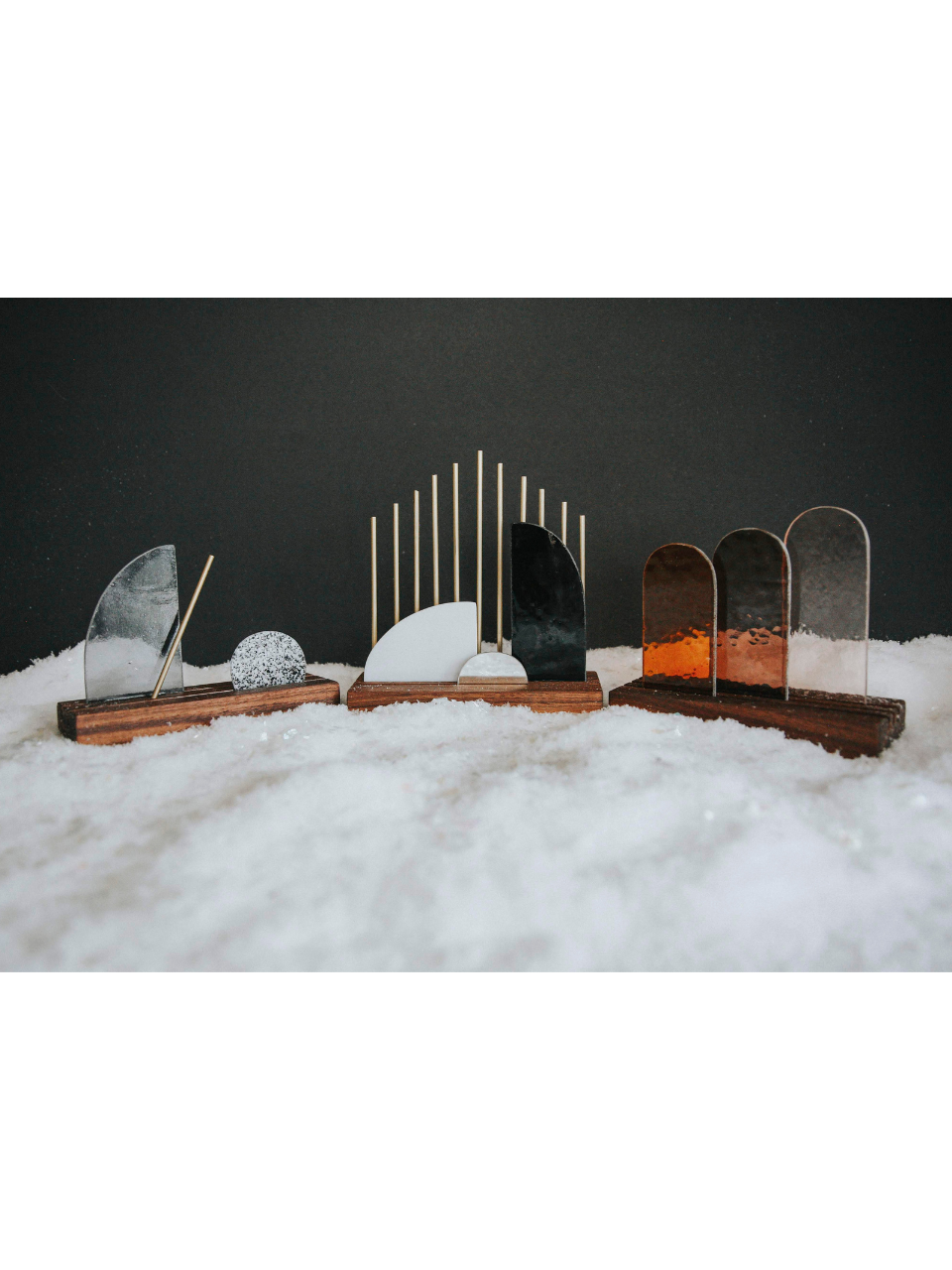 Modern Nativity is a unique, handcrafted piece, designed by the artist. Each piece of glass is hand cut, edges are polished & then adhered into a wood base. Brass bars are used for the Stable. Wood base is cut by hand, by artist’s woodworking husband of Sylvester & Sons. Glass & wood colors can vary slightly or appear slightly different in person than on screen.