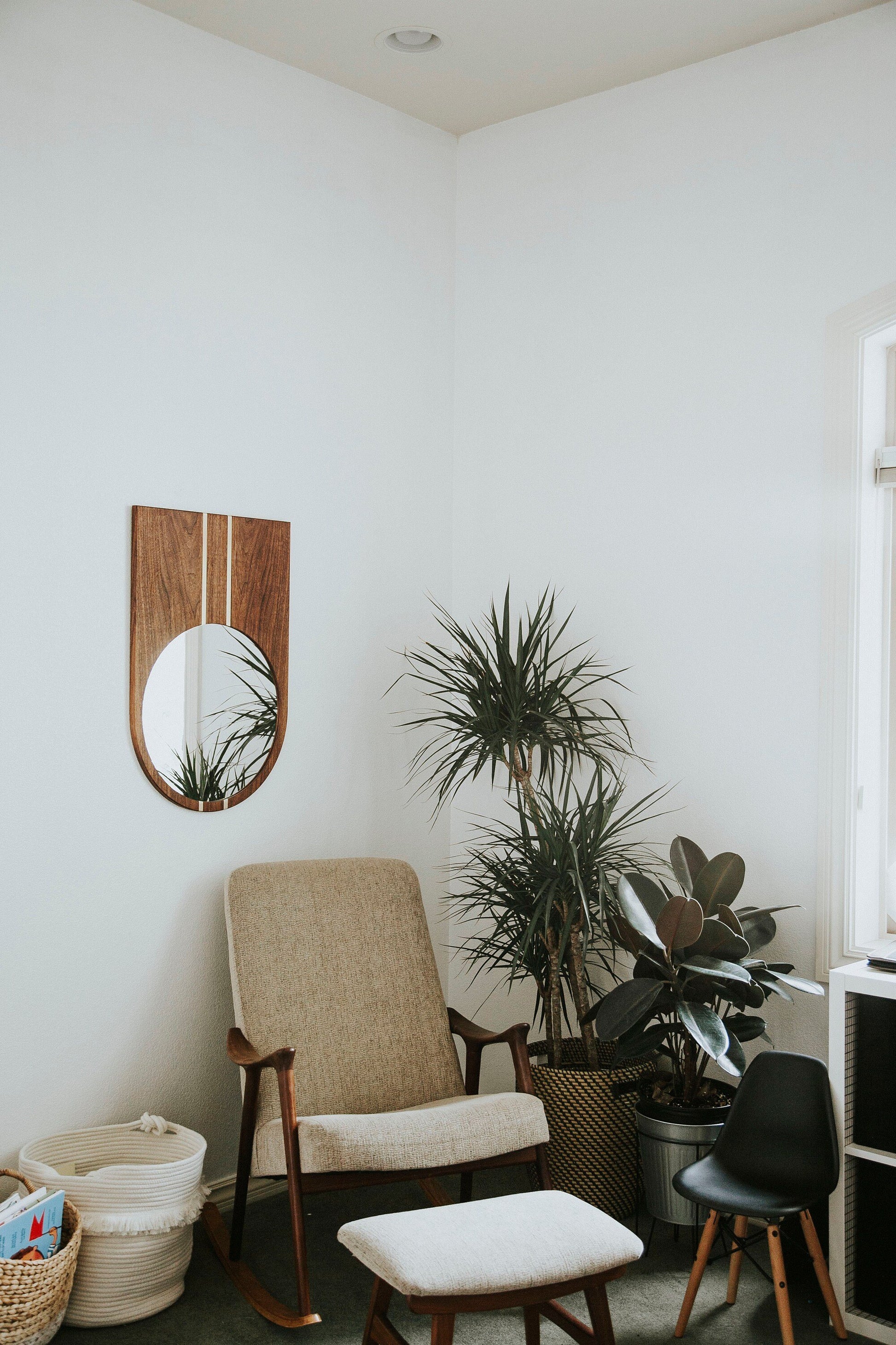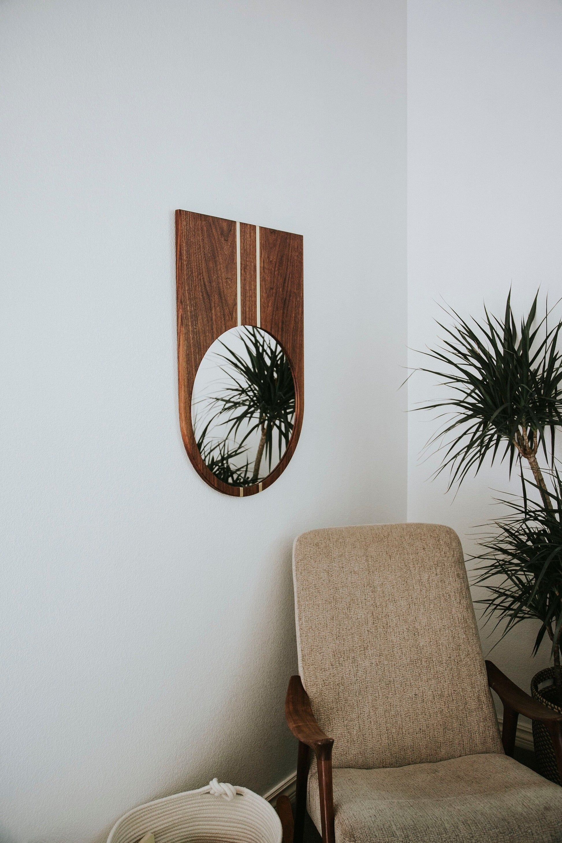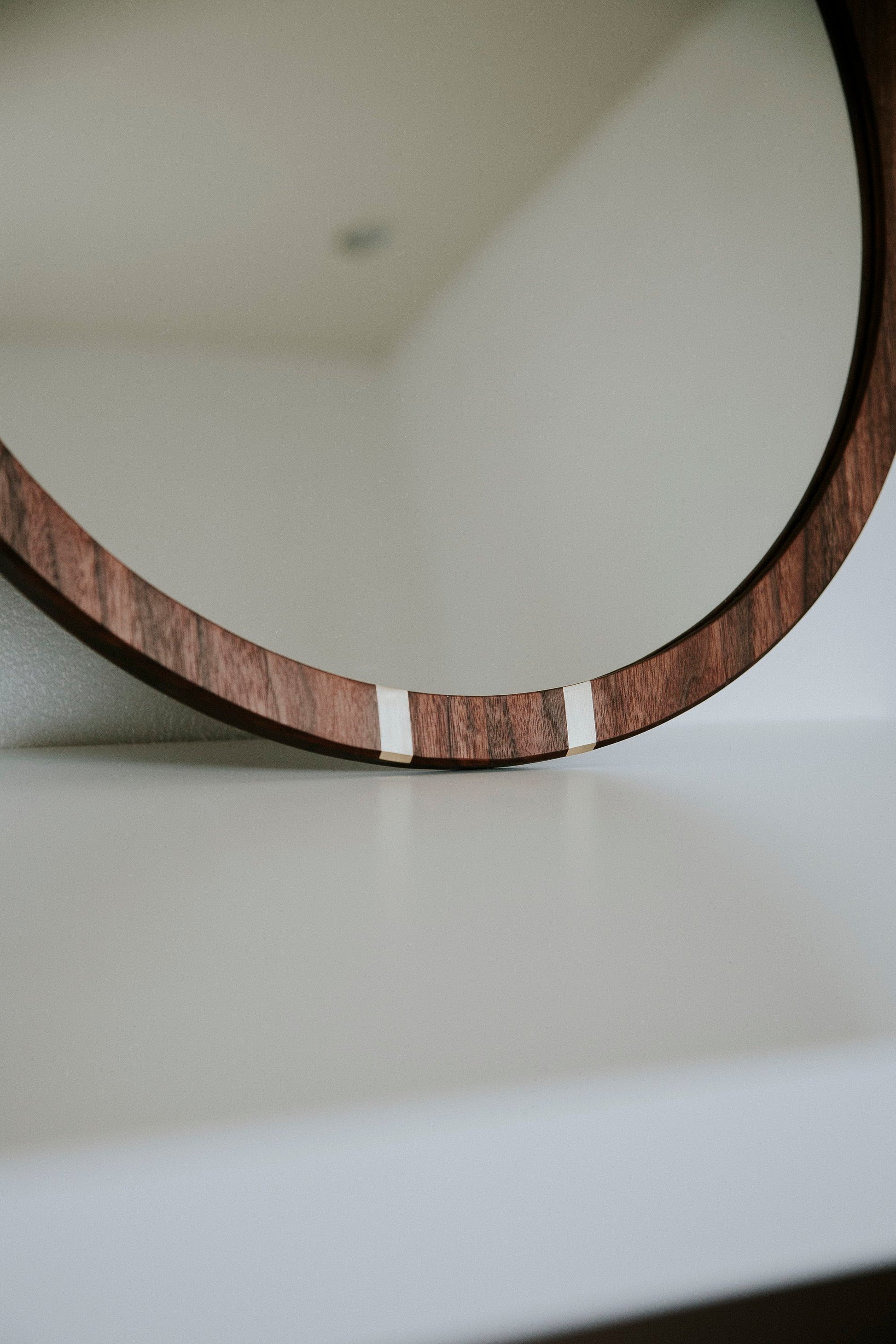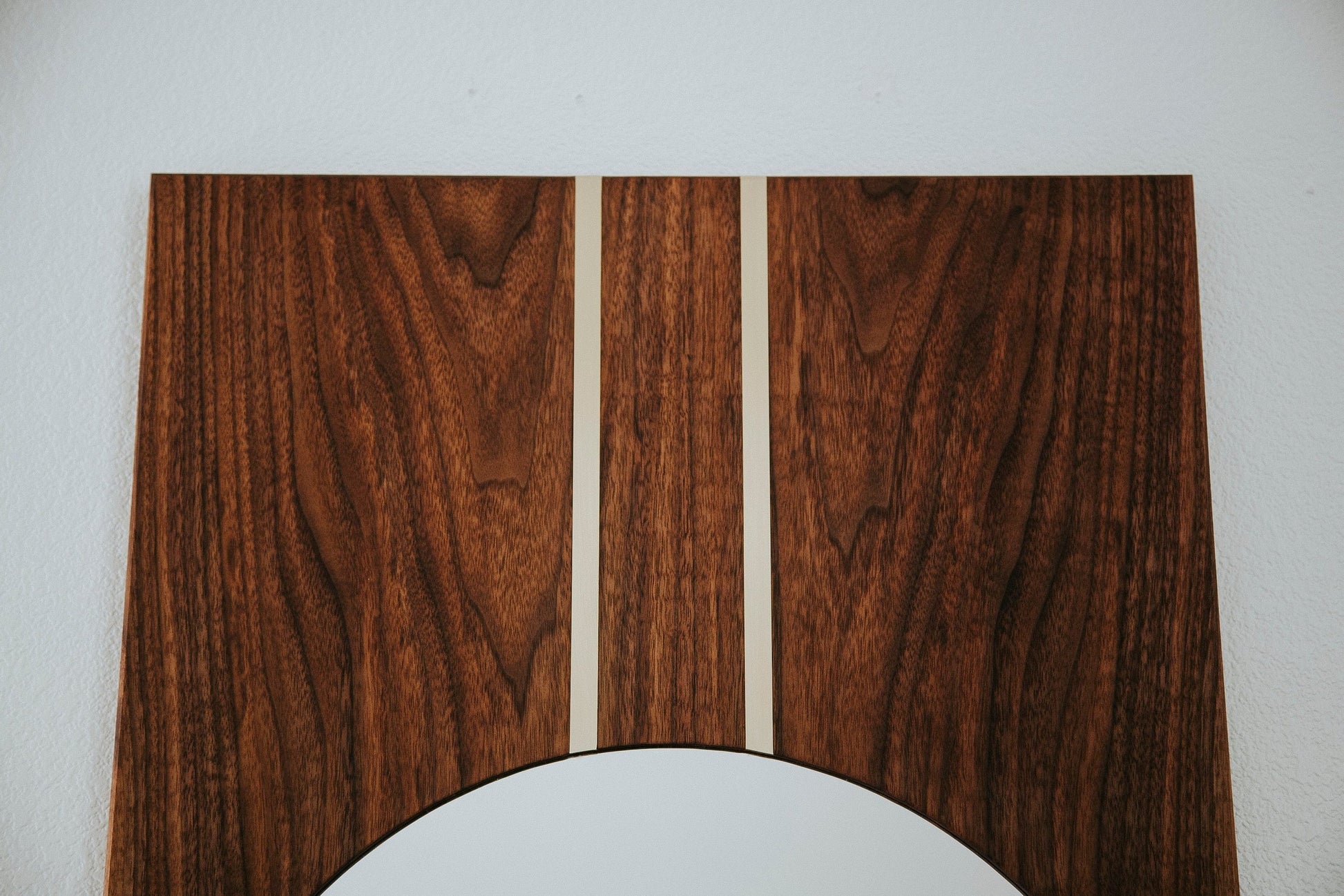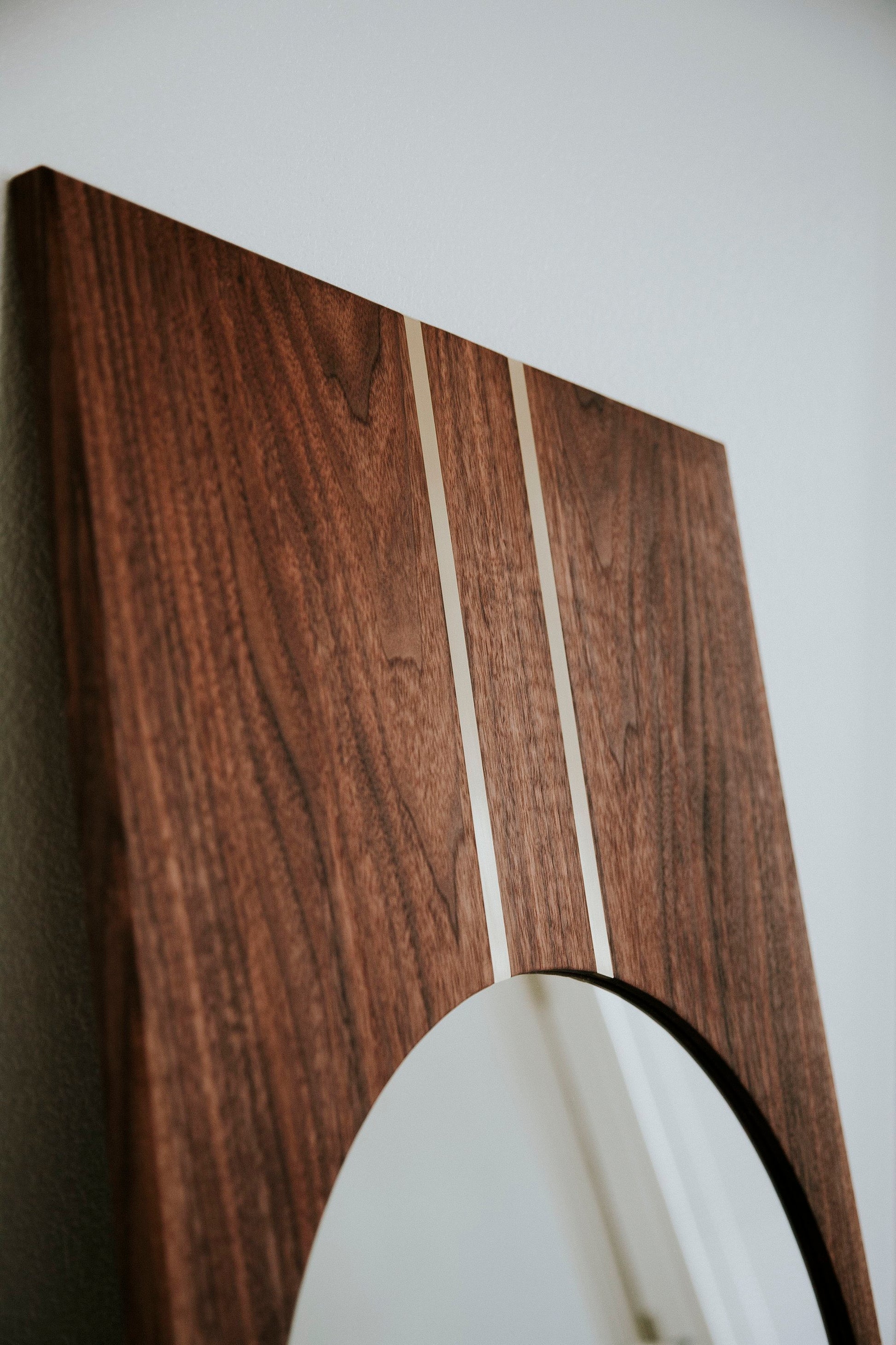 Large wall hanging mirror is handcrafted. In collaboration with Sylvester & Sons, walnut wood frame is hand cut, sanded and finished with a natural oil. Inlayed are two brass bars. Mirror hangs with circle portion at the bottom.