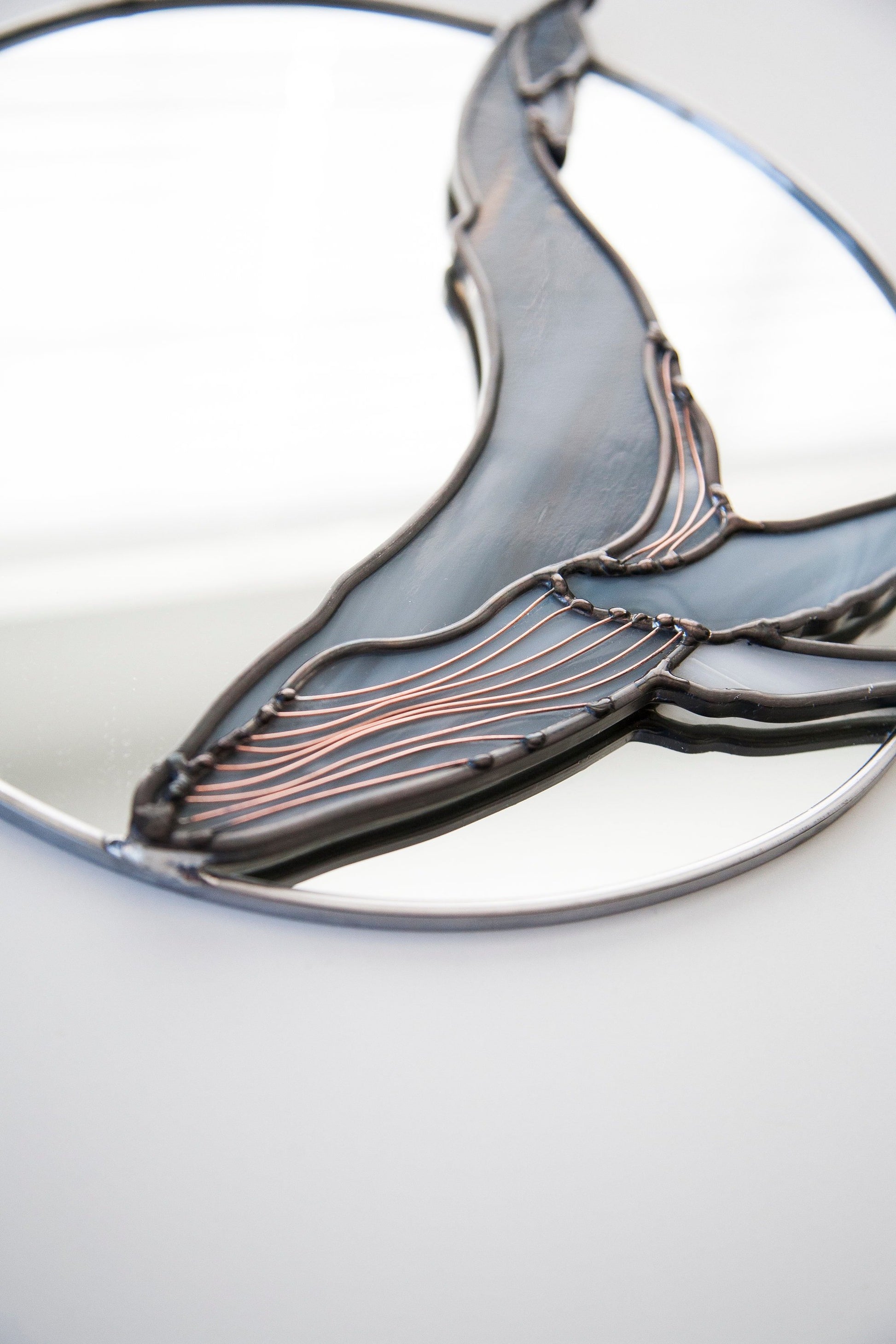 Humpback mirror is cut, sealed and assembled all by hand. Using stained glass techniques, with lead came and solder, to create this minimally designed stained glass humpback whale on top of a circle moon.