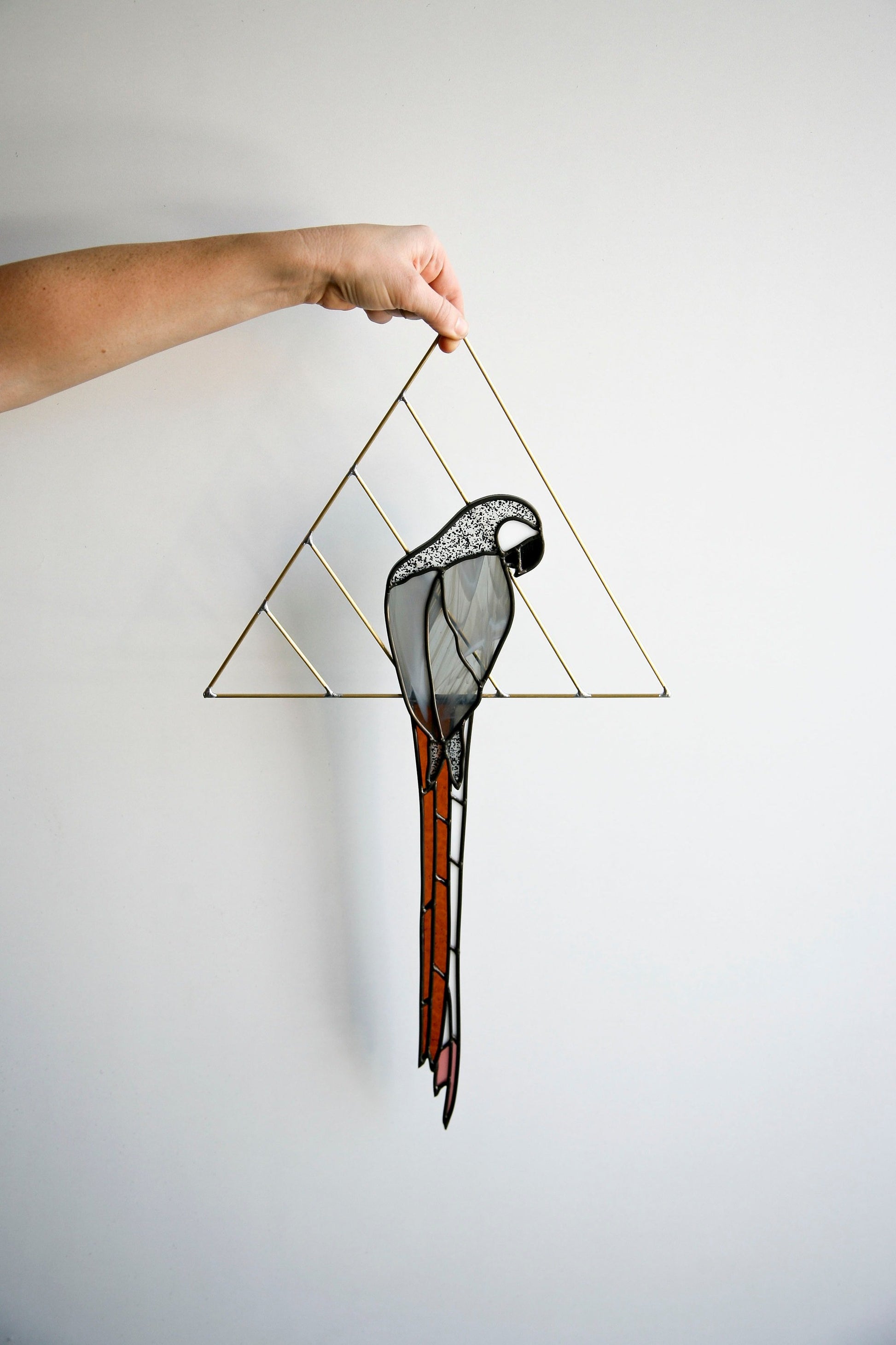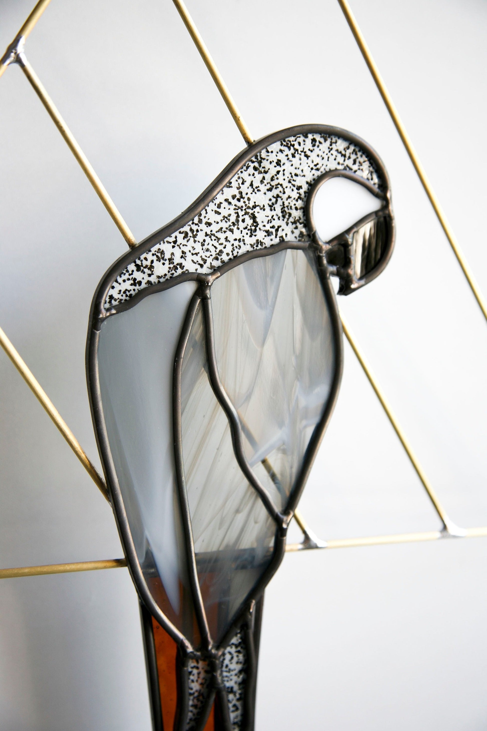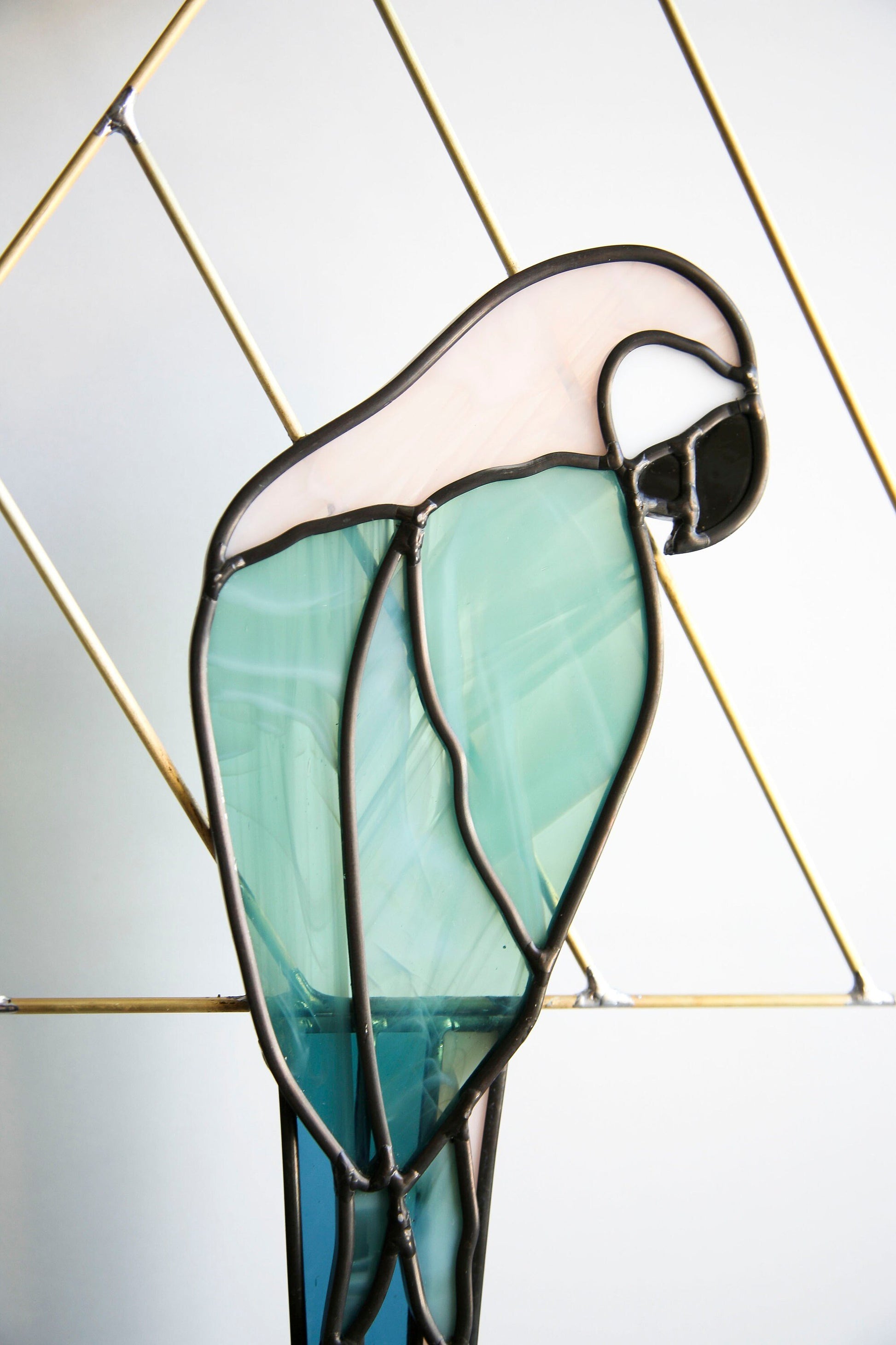 Parrot is cut and assembled all by hand. Using stained glass techniques with lead came and solder to create this minimally designed bird piece. Parrot is held by brass and tail is attached behind body of the parrot to create depth.