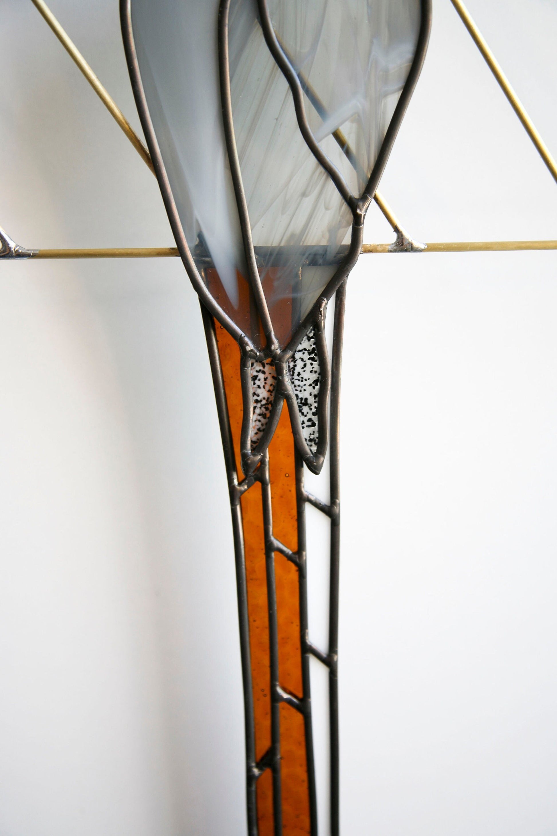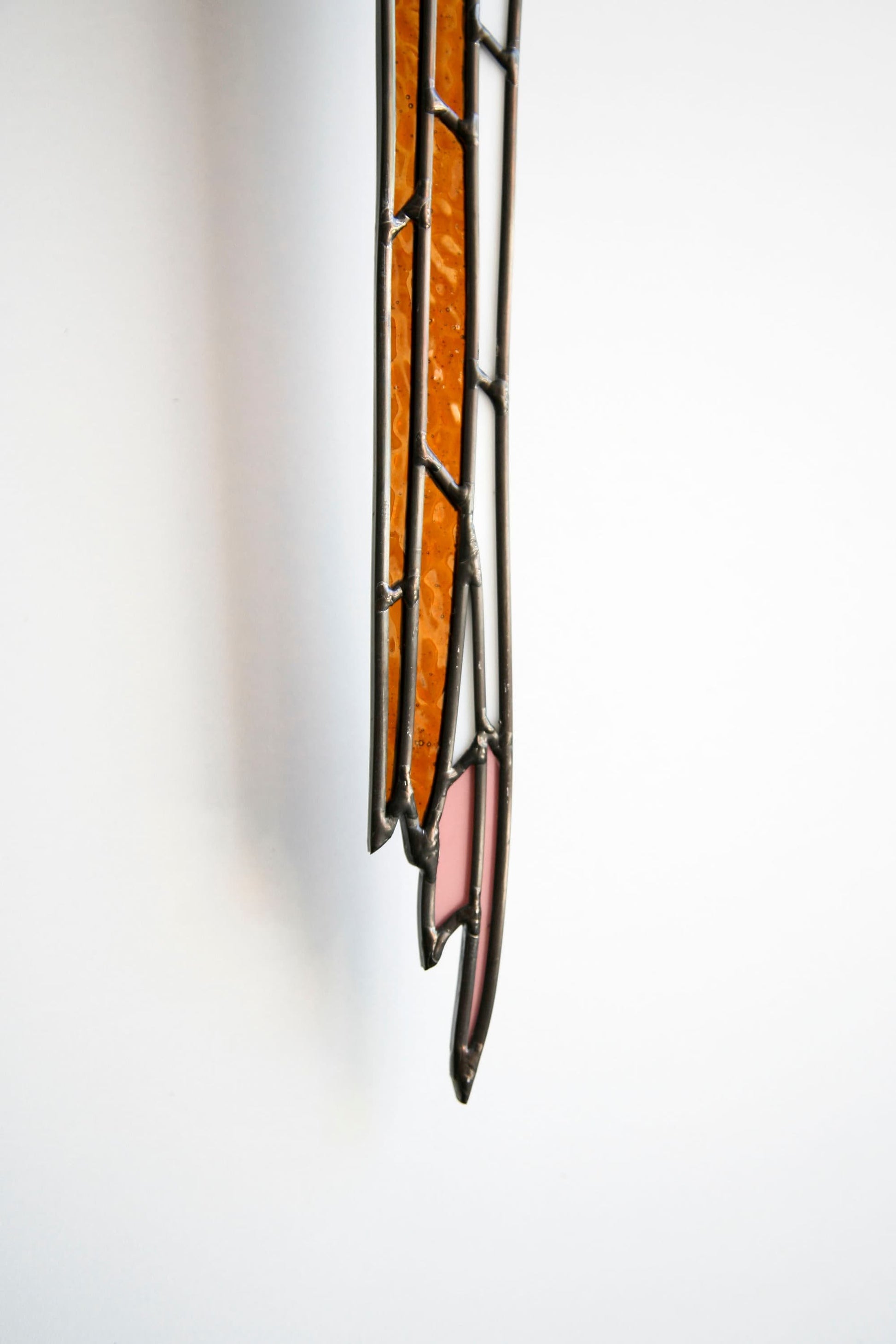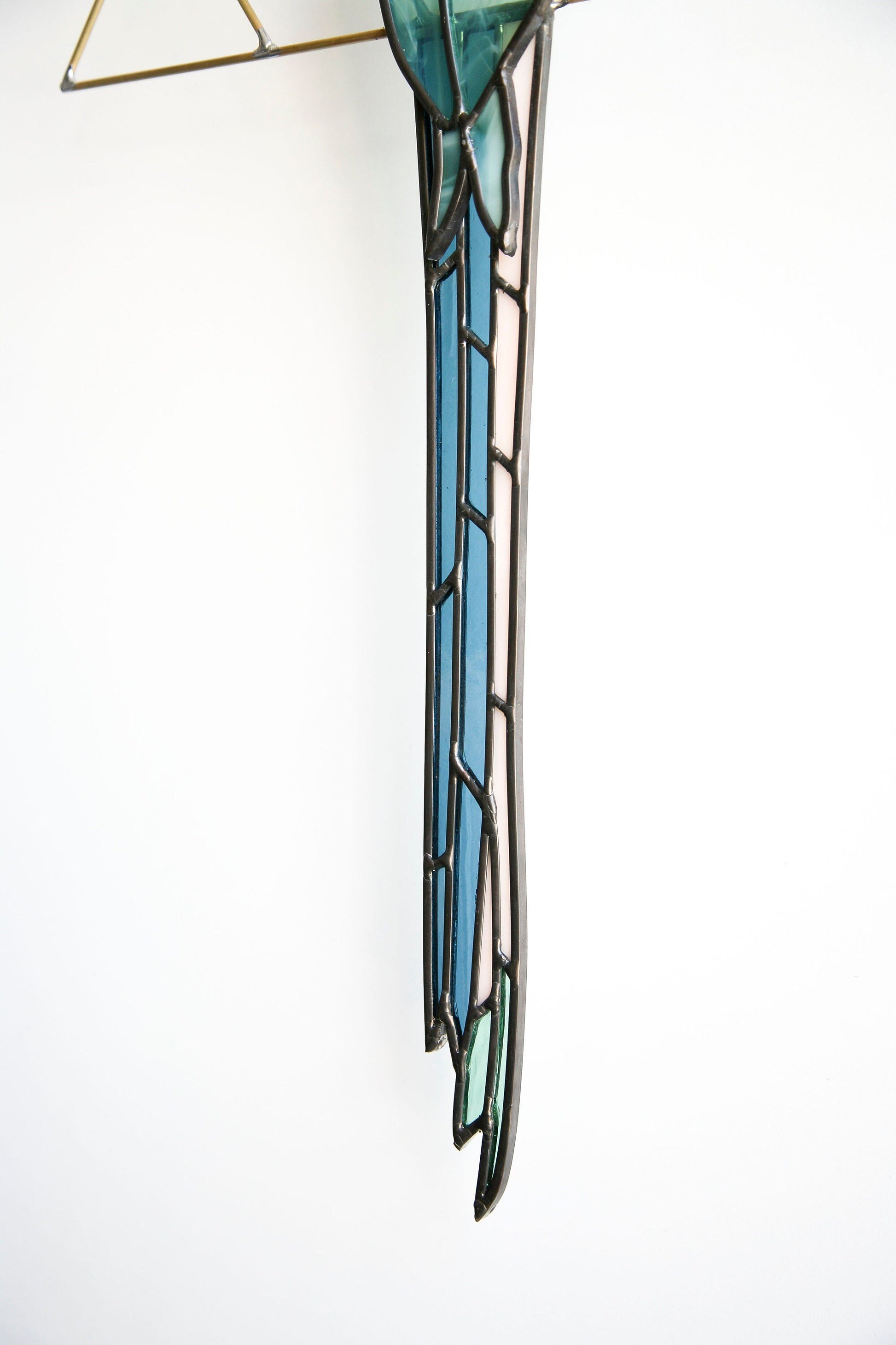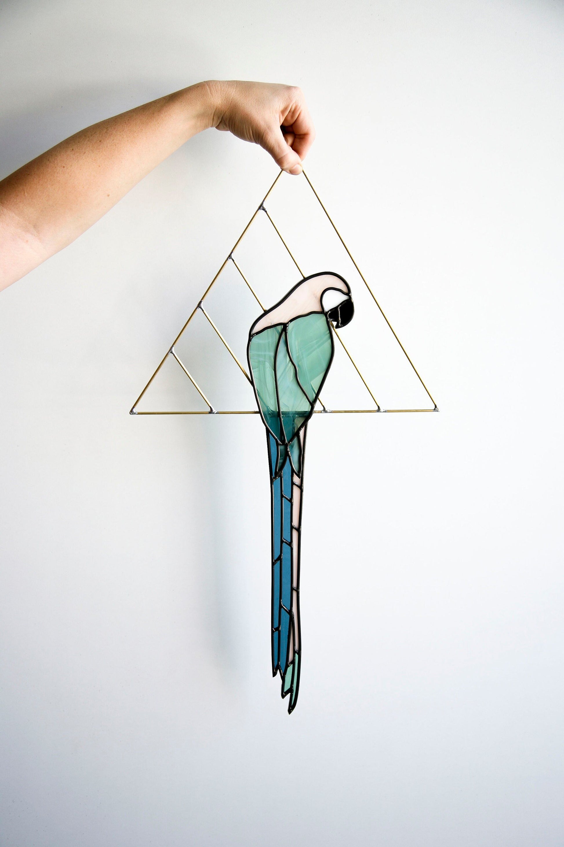 Parrot is cut and assembled all by hand. Using stained glass techniques with lead came and solder to create this minimally designed bird piece. Parrot is held by brass and tail is attached behind body of the parrot to create depth.