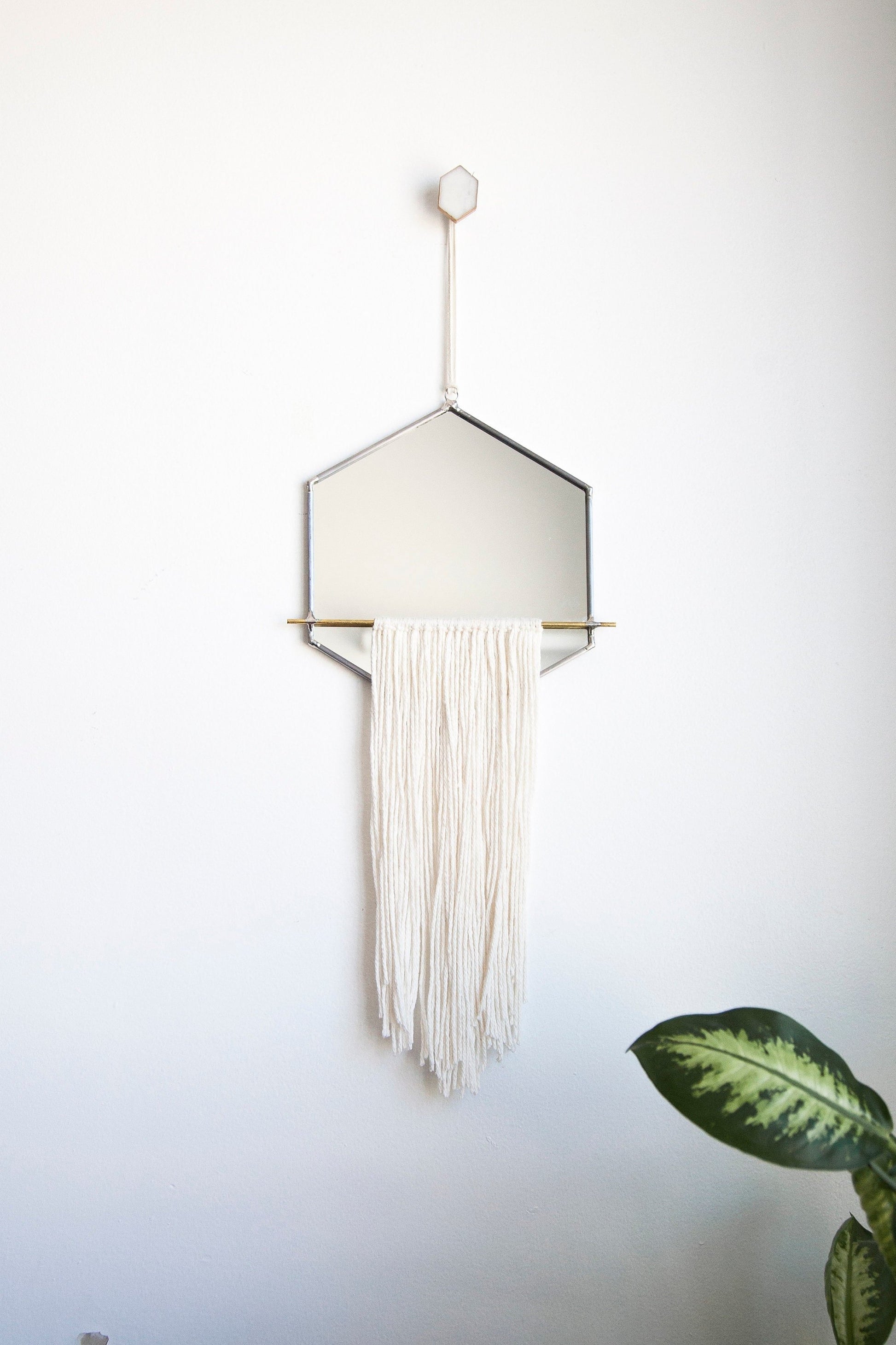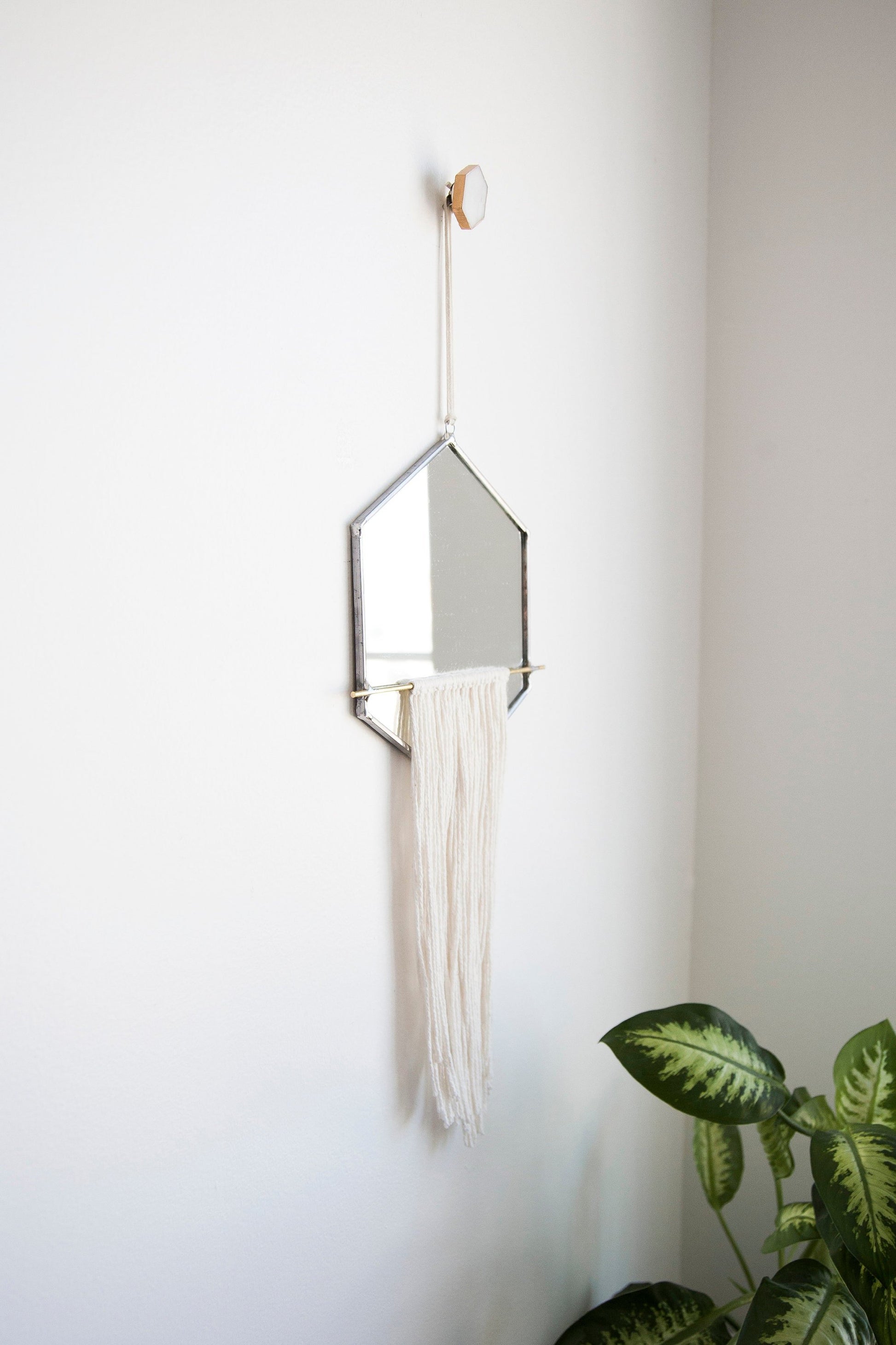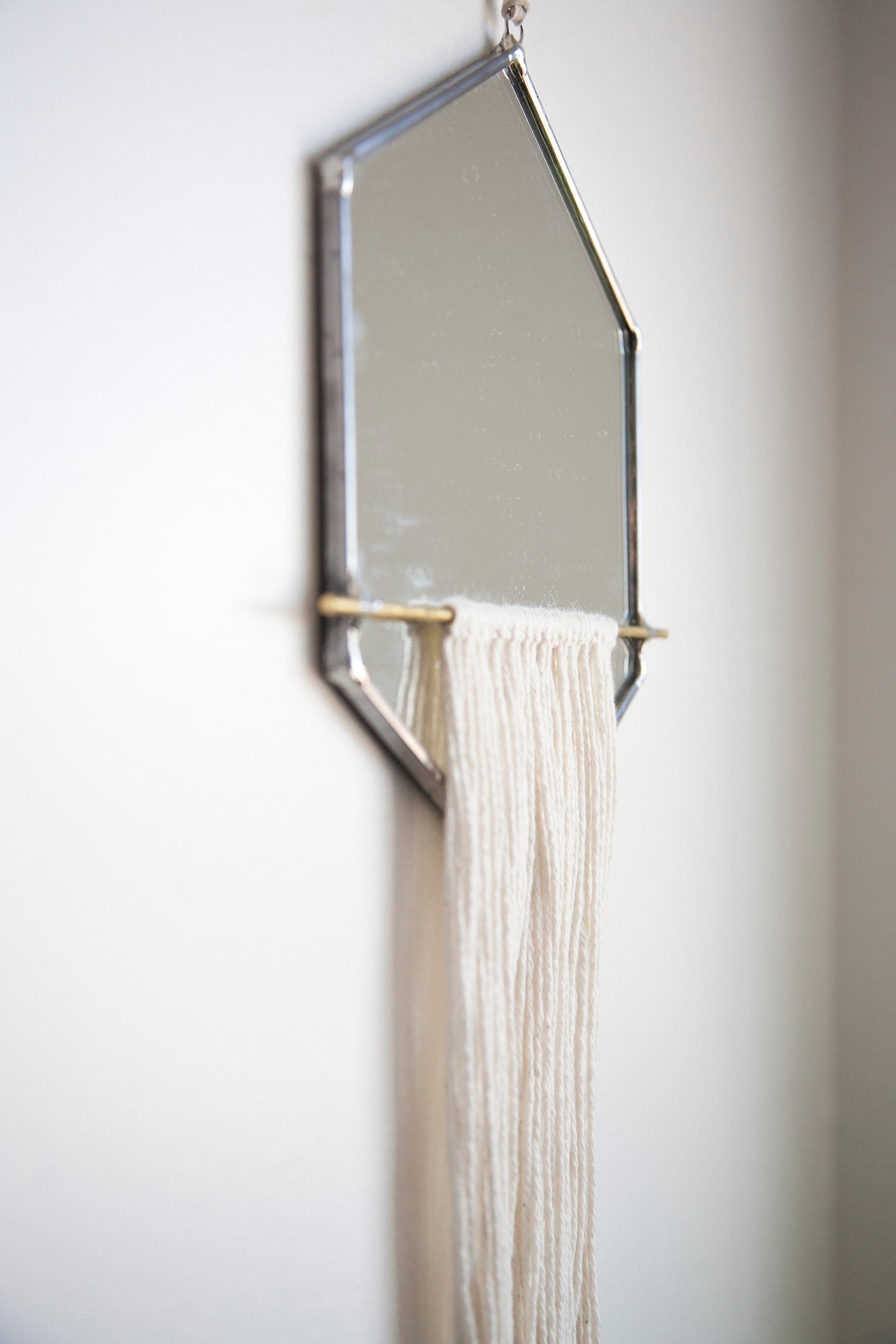 Wykrój mirror is cut, sealed and assembled all by hand. Using stained glass techniques with lead came and solder, this minimally designed mirror is detailed with hand-tied fringe.